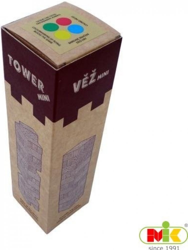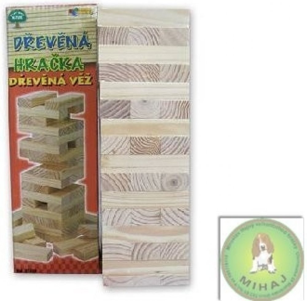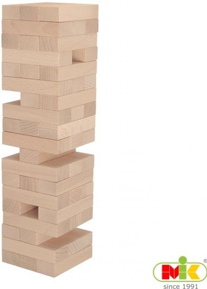 Jenga věž. Součástí balení této zábavné a napínavé rodinné hry jsou pravidla v češtině, angličtině, němčině i francouzštině. Věž také výborně slouží jako stavebnice pro menší děti od 3 let. Vyrobeno z kvalitního bukového dřeva. Popis: Hry se může zúčastnit neomezený počet hráčů. Postupně každý hřáč vytahuje jednou rukou z věže libovolný kámen a staví jej na horní patro. Cílem hry je věž neshodit. Jak věž roste, stává se labilnější a zručnost i nervy hráčů jsou podrobeny napínavé zkoušce. Vzrušení i radost ze hry roste až do okamžiku, kdy za všeobecného veselí věž padá. Hráč, který věž shodil, prohrál, poskládá kameny v ucelenou věž a hra může začít nanovo. Informace pro soutěživé: expertní hráči zvládnou s naší věží postavit přes 32 pater. Dřevěné hry a dřevěné hlavolamy M.I.K jsou navrženy pro děti i dospělé tak, aby přinášely radost a přitom rozvíjely paměť, trpělivost, logické myšlení i motorické dovednosti. Vyhovují přísným evropským bezpečnostním a hygienickým normám EN-71. Jsou vyrobeny z kvalitního bukového dřeva, kterému vděčí za zvýšenou odolnost proti rozbití i za svoji ekologičnost. Koupí tohoto výrobku podpoříte českého výrobce firmu M.I.K vyrábějící dřevěné hračky, dřevěné hlavolamy, dřevěné stavebnice, společenské hry ze dřeva (např. jenga věž), učební pomůcky a dřevěné reklamní předměty.