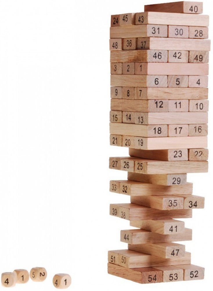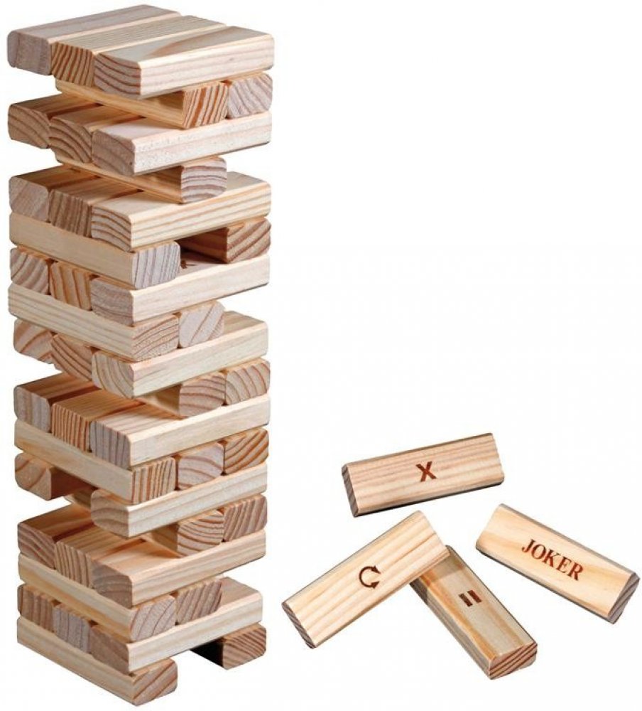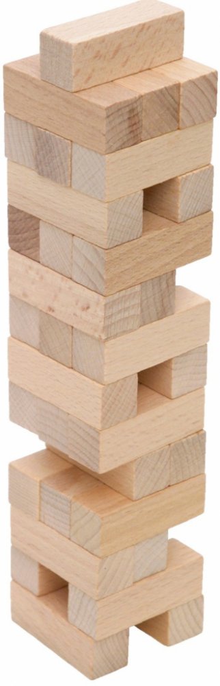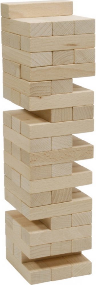 Jenga věž. Součástí balení této zábavné a napínavé rodinné hry jsou pravidla v češtině, angličtině, němčině i francouzštině. Věž také výborně slouží jako stavebnice pro menší děti od 3 let. Vyrobeno z kvalitního bukového dřeva. Popis: Hry se může zúčastnit neomezený počet hráčů. Postupně každý hřáč vytahuje jednou rukou z věže libovolný kámen a staví jej na horní patro. Cílem hry je věž neshodit. ...