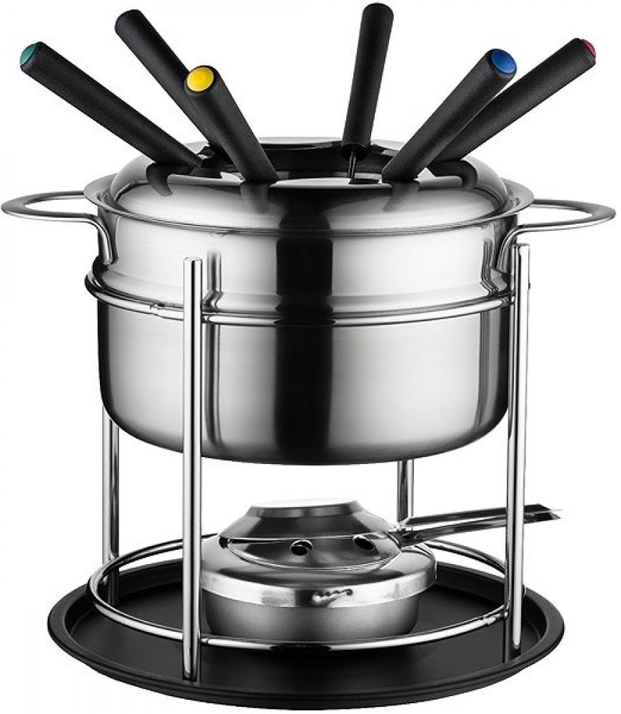 Součástí balení je 6 barevně označených fondue vidliček, takže každý snadno pozná tu svou. Praktický anti-splash kroužek pomáhá zabránit rozstřiku a kovový stojan se 4 protiskluzovými nožičkami zajišťuje stabilitu při používání.