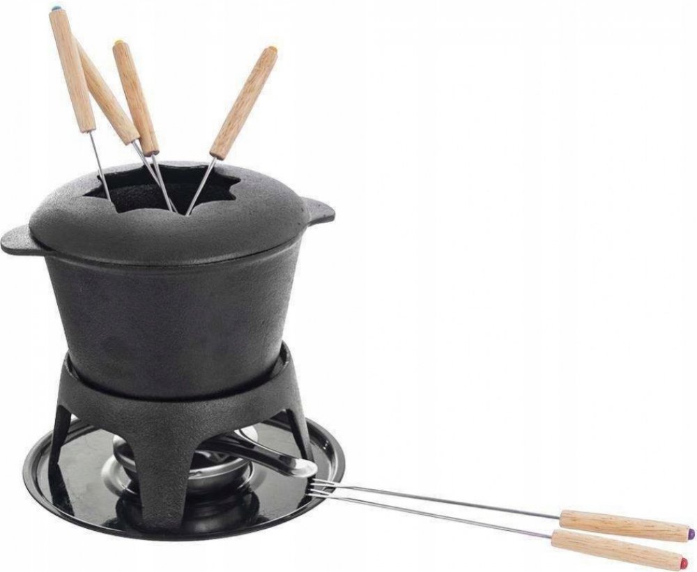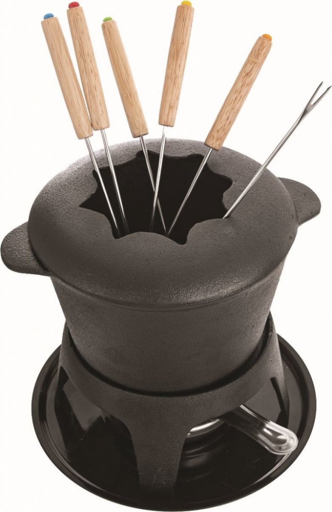 Součástí setu je litinová nádoba s uchy a s víkem (pr. 16 cm, v. 10 cm), litinový stojan (v. 8 cm), nerezový kahan, 6 barevně odlišených vidliček (d. 24 cm) a plechový podnos (pr. 21 cm).