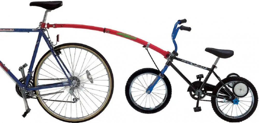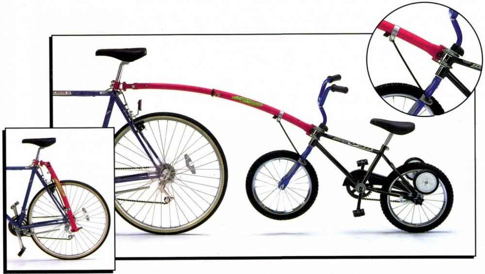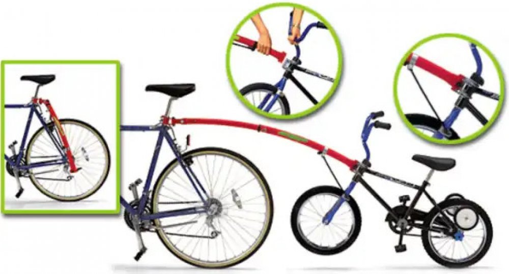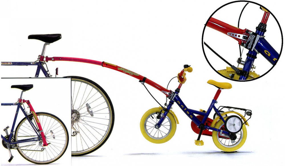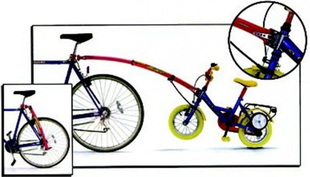 Vodící tyč pro spojení dětského kola s kolem dospělého. Tyč je složena na kole dospělého, lze ji kdykoliv, bez použití nářadí, připojit k úchytu namontovaném na dětském kole. Dětské kolo má pak stabilizované řidítka proti otočení, řídí dospělý. Dítě může pomáhat šlapáním. Podmínky použití :