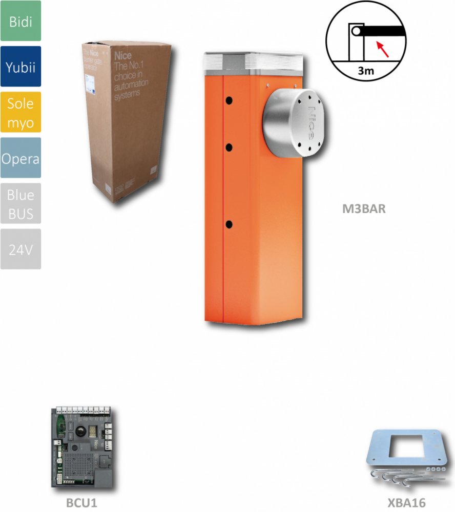 M3BAR automatická závora do 3 m (24 V, 150 W, 100 Nm) řídicí jednotka BCU1, 1x základová deska XBA16, bez ramena
