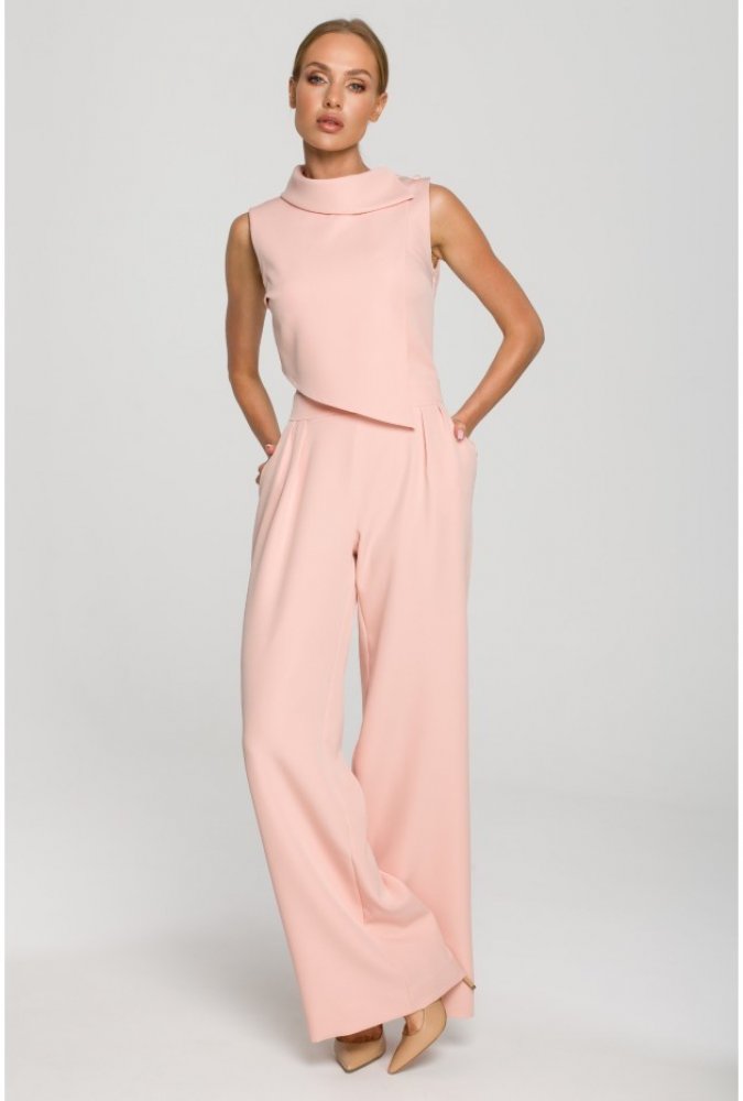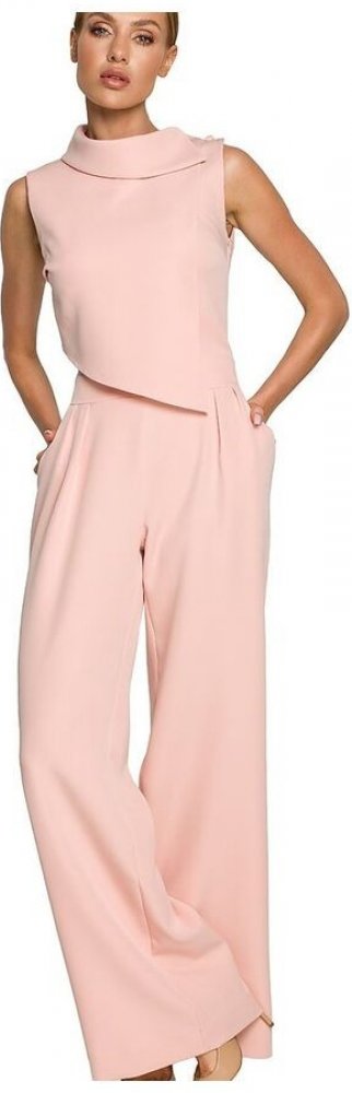 Zajímavě řešený jedinečný overal s širokými nohavicemi, úzkým pasem, dvouvrstvým asymetrickým topem a vysokým límečkem se zajímavým zapínáním. Zapínání na skrytý zip na zádech.