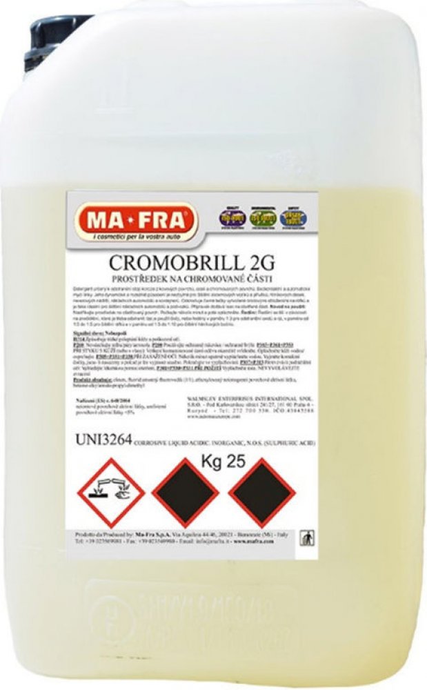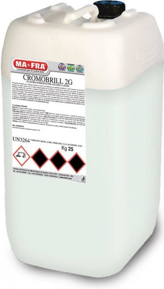 Detergent určený k odstranění stop koroze z kovových povrchů, oceli a chromovaných povrchů. Bezkontaktní a automatické mycí linky. Detergent určený k odstranění stop koroze z kovových povrchů, oceli a chromovaných povrchů. Bezkontaktní a automatické mycí linky. Jeho dynamické a rozsáhlé působení je nezbytné pro čištění cisternových vozíků a přívěsů, hliníkových desek, nerezových nádrží, nákladních automobilů a kontejnerů. Odstraňuje černé tečky vytvořené brzdovými obloženími na ráfků a je také ideální pro čištění nákladních automobilů a podvozků. Přípravek dodává lesk na ošetřené části. Návod na použití: Nastříkejte prostředek na ošetřovaný povrch Počkejte několik minut a poté opláchněte. Ředění: Ředění se liší v závislosti na znečištění, které je třeba odstranit: lze je použít čistý, nebo ředěný v poměru 1:3 pro odstranění oxidů a rzi, v poměru od 1:3 do 1:5 pro čištění ráfků a v poměru od 1:5 do 1:10 pro čištění hliníkových bočnic.