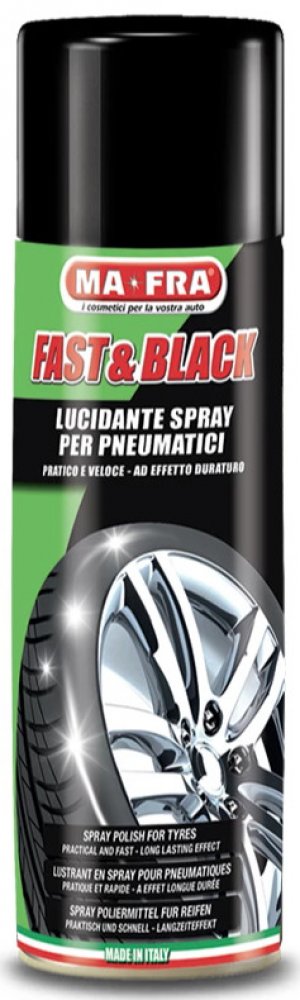 FAST & BLACK je praktický, lešticí a antistatický sprej s rychlým použitím, který nemastí a nelepí. Odolá třem mytím, má dlouhou trvanlivost, chrání a oživuje původní barvu pneumatik. Zároveň pneumatiky šetří před tvořením prasklin a před atmosférickými a chemickými vlivy. FAST & BLACK se také používá v autoopravnách a autosalonech, kde rychlým tahem nechá nejlépe a dlouhodobě vyniknout barvu pneumatik všech vystavených modelů. FAST & BLACK je pro své praktické vlastnosti a rychlost použití určen také pro použití kolem shromáždění a výstavišť a prodává se v pohodlné sprejové nádobce o obsahu 500 ml.