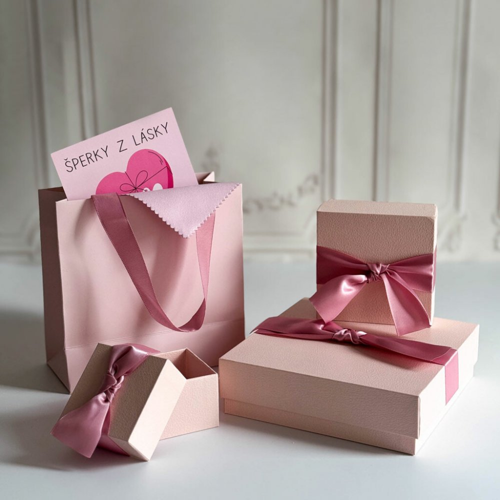 V balení naleznete elegantní krabičku, taštičku, jemný hadřík na čištění šperků a kartičku na věnování – vše sladěno do jednoho harmonického celku.
