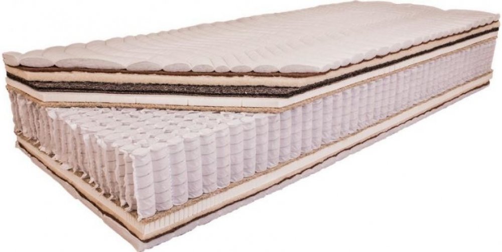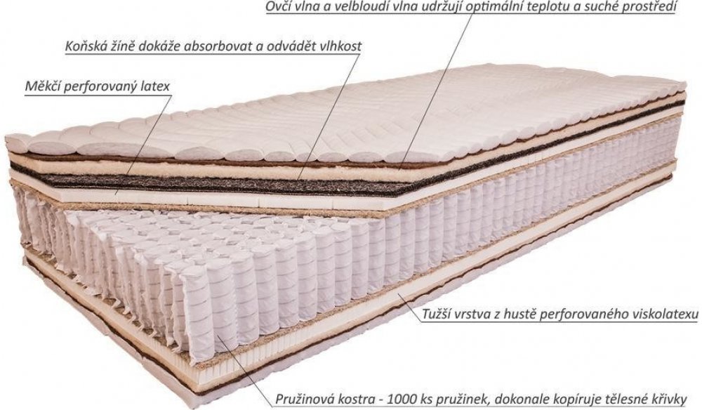 Uvnitř jsou pouze výběrové přírodní materiály, které si necháváme připravovat pro výrobu luxusních matrací. Hustě perforované latexové desky se zvýšenou gramáží, odolný a prodyšný sisal, koňská žíně s vysokou gramáží bez zbytečného kaučukového pojiva, 500 gr čisté výběrové vlny, velbloudí vlna a nakonec vrstva viskózy s kapokem. To vše na kvalitní 15 cm vysoké taštičkové pružině (1000 ks) nabízí uživateli mimořádný pocit luxusního odpočinku. Přírodní materiály se postarají o optimální mikroklima, absorpci vlhkosti a udržení příjemné teploty.