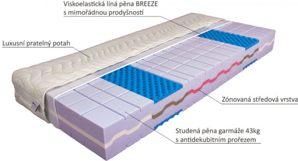 Sedmizónová matrace z velmi prodyšné HR studené pěny s obsahem rostlinného oleje ze sóji. Můžete vybírat ze tří tuhostí HR pěny vysoké gramáže.