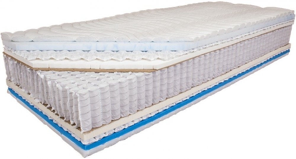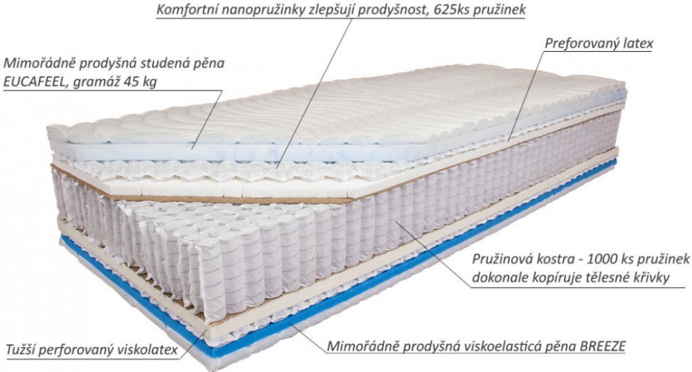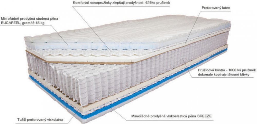 Uvnitř jsou pouze špičkové materiály jako je 15 cm vysoká taštičková pružina s vysokým počtem pružinek (1000 ks), hustě perforované latexové desky vysokou gramáží a optimální měkkostí. Změkčující nano pružinky pod povrchem umožňují lepší cirkulaci vzduchu. Horní vrstvy z výjimečných vysokogramážových pěn EUCAFEEL a BREEZE. Pěna EUCAFEEL je high-tech HR studená pěna (45 kg/m3) měkká jako peříčko s nekonečnou životností. BREEZE je viskoelastická pěna (50 kg/m3) s mimořádnou prodyšností. Byla naměřena 6x vyšší prodyšnost ve srovnání s běžnou viskoelastickou pěnou.