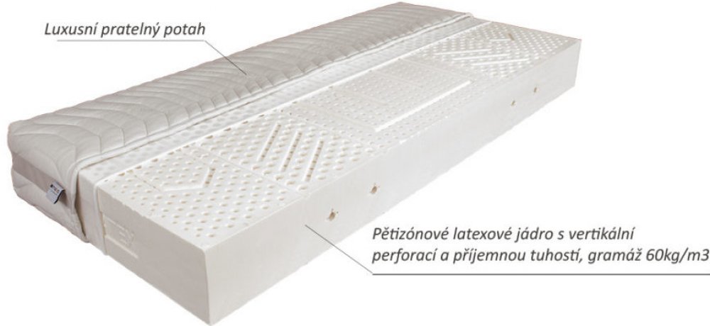 Komfortní vysoká latexová matrace střední tuhosti s pěti anatomickými zónami a luxusním potahem. Výjimečné pohodlí díky vysokému latexovému jádru. Latexová pěna působí antibakteriálně. Perforace jádra zlepšuje prodyšnost matrace. Doporučujeme položit na laťový rošt COMPACT nebo na pevnou podložku. Matrace má 5 zón.