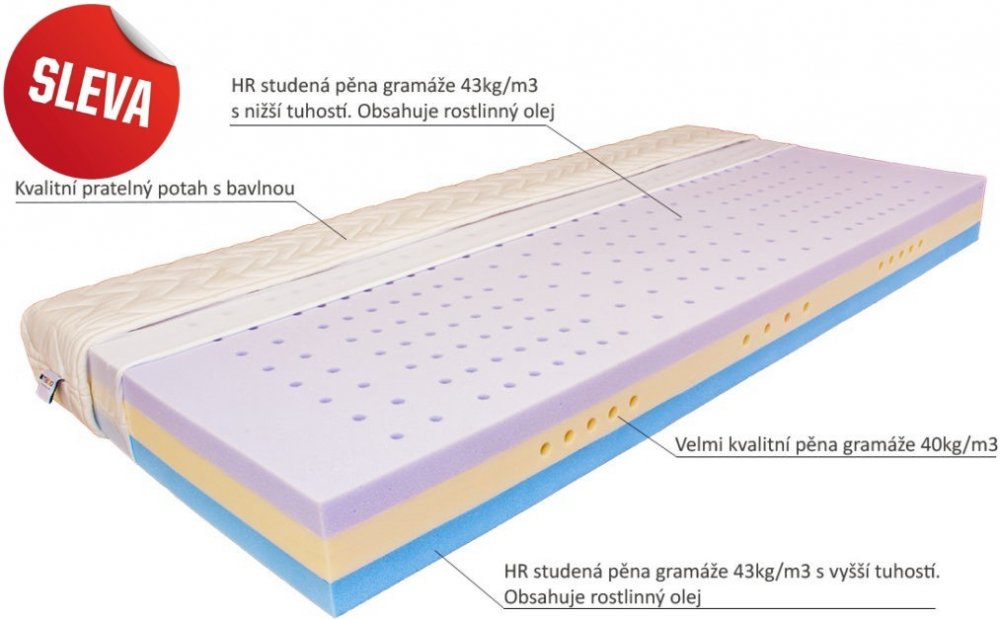 - HR studená pěna (gramáže 45 kg/m3 ) – tužší (obsah sóji) - světle modrá barva pěny