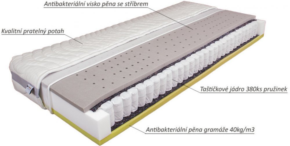 Podrobnosti o produktu mbo74_20911 100 x 200 x 24 Kvalitní pružinová matrace s jádrem z taškových pružinek (380ks pružinek, drát 2mm). Pro lehací vrstvy jsou použity antibakteriální pěny gramáže 40 kg/m3 s výškou 3 cm a antibakteriální viscoelastická-líná pěna s technologií SILVER-IONS s účinným termoregulačním účinkem s výškou 3 cm. Tyto lehací vrstvy jsou upraveny zónovým děrováním tak, aby doko...
