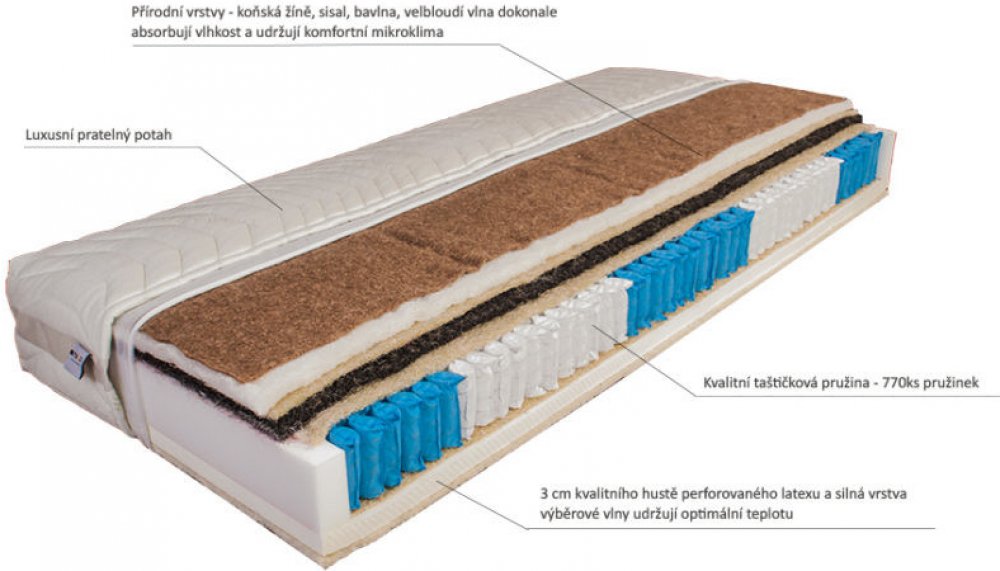 Komfortní pružinová matrace z taštičkových pružin s velkým podílem přírodních materiálů. Základem matrace je pružinová kostra s velkým počtem taštičkových pružinek – 770 ks v rozměru 90×200. Tento vysoký počet pružinek dokáže výborně kopírovat tělesné křivky. Průměr drátu 1,5/1,4 mm.