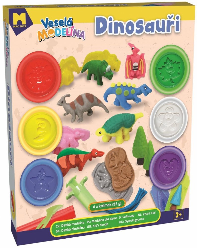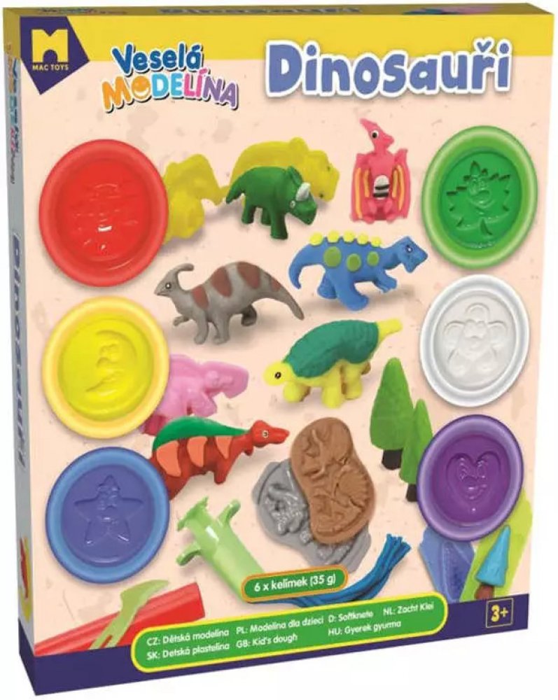 Veselá modelína - Dinosauři, modelovací hmota s nástroji a formičkami pro děti. Užijte si spoustu zábavy. S touto modelínou se výborně pracuje, dá se velice dobře vykrajovat. Sada obsahuje modelíny, formičky a plastový nožíky různých tvarů.