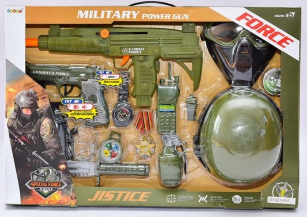 Sada pro malého vojáka s helmou, pistolí a dalším příslušenstvím.