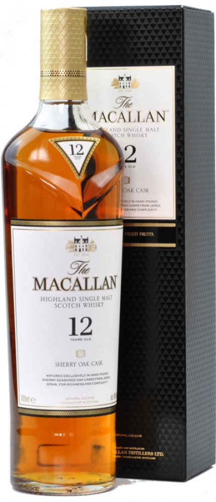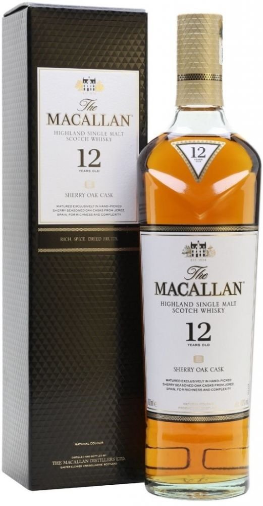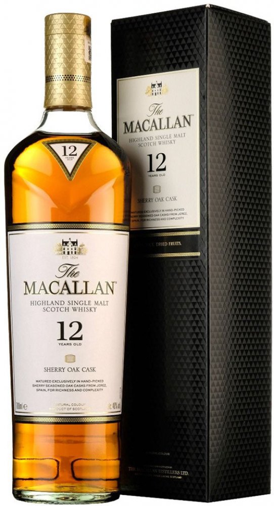 Macallan 12 Years Old Sherry Oak má úžasné aroma sušeného ovoce, především meruněk, vanilky a zázvoru. Chuť navazuje na vůni, obsahuje příjemně nasládlé tóny sherry, dubového dřeva s jemným kouřovým zabarvením. Palírna Macallan patří k nejlepším výrobcům jednosladové whisky, k výrobě používá špičkovou odrůdu ječmene Golden Promise.