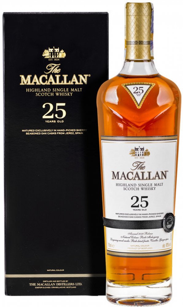 Macallan Sherry Oak 25 let je součástí naší řady Sherry Oak, která zahrnuje řadu jednosladových whisky zrajících výhradně v ručně vybíraných dubových sudech po sherry z Jerezu, které dodávají whisky bohatost a komplexnost. Tato speciální single malt whisky přináší intenzivně bohatý a plný charakter chuti, citrusů, sušeného ovoce a dřevěného kouře.