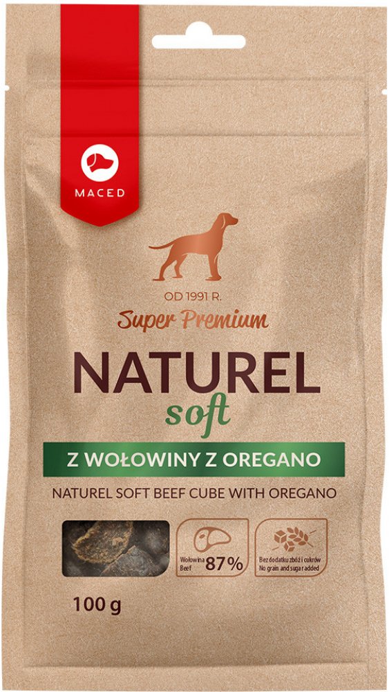 Přirozeně chutné, vyvážené a přizpůsobené stravě psů: Maced Super Premium Naturel Soft Beef with Oregano je vysoce kvalitní pamlsek pro vašeho psa, vyrobený z těch nejlepších surovin. Pamlsky pro dospělé psy obsahují 87 % hovězího masa, které zároveň slouží jako jediný zdroj živočišných bílkovin - ideální pro psy s intolerancí na jiné bílkoviny. Kromě toho je v pamlscích obsaženo oregano, které může podpořit přirozené trávení. Krmivo Maced Super Premium Naturel Soft Beef with Oregano neobsahuje obiloviny. Pamlsky jsou velmi chutné, nádherně šťavnaté a měkké, takže je zaručen požitek při mlsání. Maced Super Premium Naturel Soft Beef with Oregano: Prémiový pamlsek pro dospělé psy všech plemen. Vysoký obsah masa: obsahuje 87 % hovězího Vylepšené s oreganem: obsahuje látky s antibakteriálními a protiplísňovými účinky, díky obsaženým tříslovinám a hořkým látkám může také podpořit proces trávení Jediný živočišný protein: obsahuje pouze jeden zdroj živočišných bílkovin (hovězí maso) Bez obilovin: vhodné pro psy s alergiemi a intolerancemi Velmi chutné: měkké, šťavnaté kousky