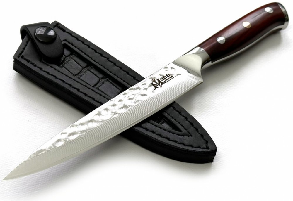 nůž • délka ostří: 15 cm • druh nože: kuchyňský • materiál čepele: damašek • jádro čepele: VG10 ocel • tvrdost: 60 HRC • nerezová patka • rukojeť: ušlechtilé dřevo součástí • součástí ochranné pouzdro