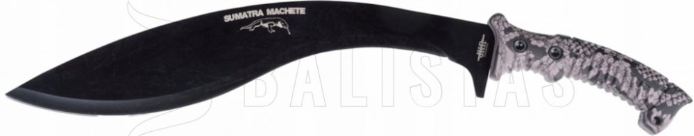 Mačeta Joker Sumatra JKR713. Mačeta typu kukri s 35,5 cm zahnutou nerezovou čepelí full-tang a ergonomicky tvarovanou rukojetí se vzorem hadích šupin vhodná zejména pro náročnější úkony. Součástí balení je i nylonové pouzdro.