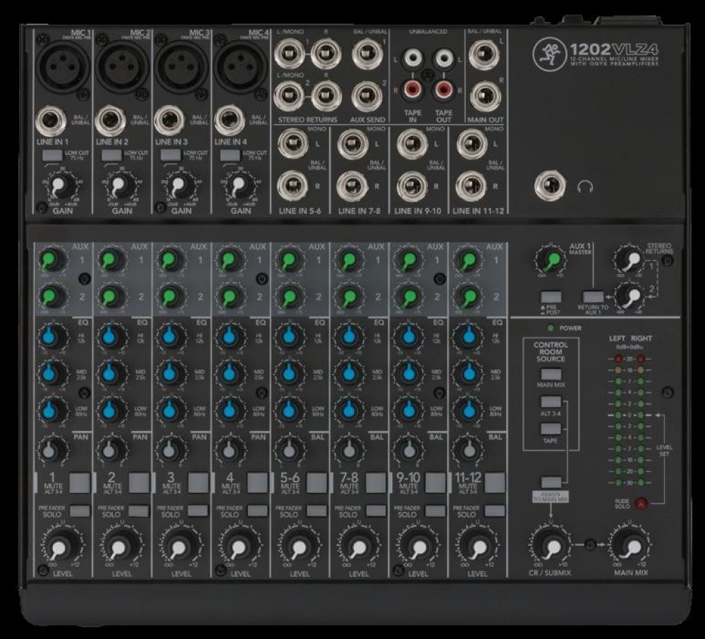 Mackie 1202-VLZ3 nabízí širokou konektivitu. 8 linkových vstupů jako přídavek k prvním čtyřem mikrofonním/linkovým vstupům a stereo RCA vstupy a výstupy. Kromě hlavního stereo výstupu, který je osazen symetrickými konektory XLR i ¼“ Jack, je k dispozici i insert pro čtyři kanály a sluchátkový výstup. Vybavení doplňuje 12-segmentový LED indikátor úrovně signálu. Mixážní pult nabízí funkci PFL solo, pan a mute pro každý kanál. Mute navíc při aktivaci přesměrovává signál na další sběrnici (Alt Out), což je skvělé pro tvorbu submixů nebo pro náslech jednotlivých kanálů.