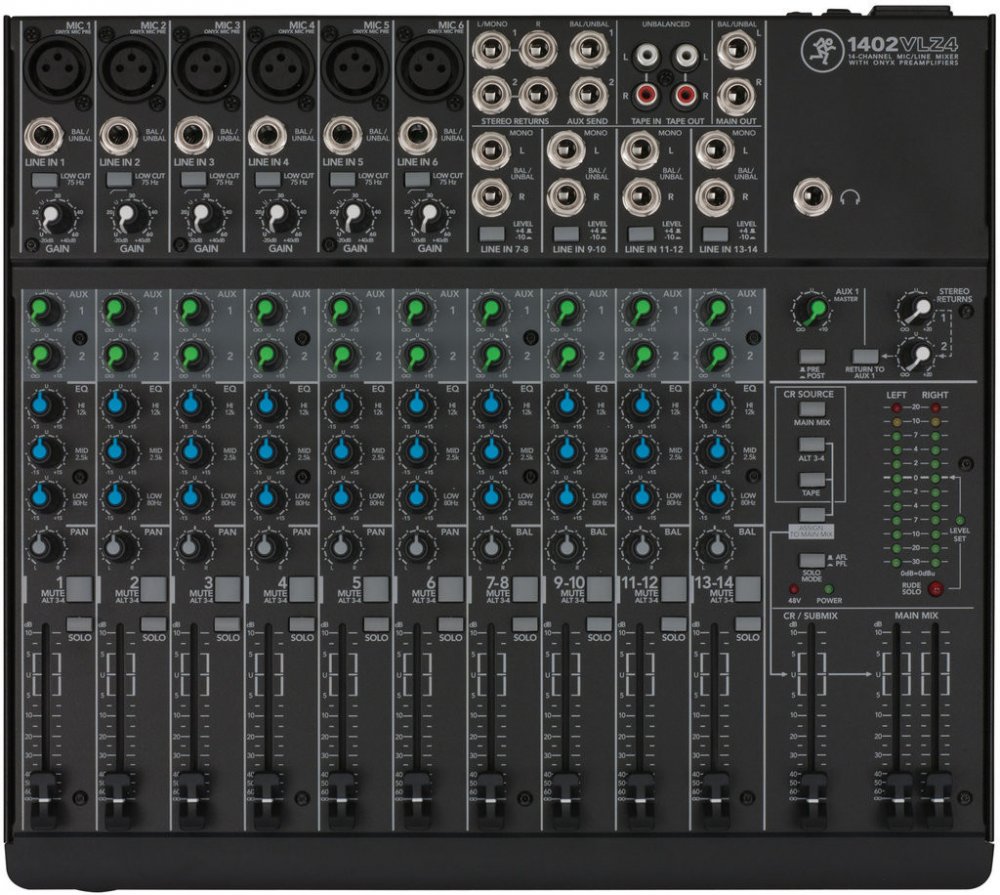 Konkrétně 1402-VLZ3 je kompaktní 14 kanálový mixpult, který nabízí 12 linkových vstupů a 6 mikrofonních vstupů, kdy u mikrofonních jsou použity kvalitní předzesilovače XDR2 Extended Dynamic Range. Ty nabízí až 60 dB rozsah gainu, díky čemuž je možné v dynamickém rozsahu dostat až na 130 dB. Zajišťují to nejvěrnější zesilení signálu na všech frekvencích a minimální úroveň zkreslení. Samozřejmě nabízí i phantomové napájení při použití kondenzátorových mikrofonů. U 1402-VLZ3 lze použít i nástrojové vstupy, díky kterým nebudete potřebovat žádné DI boxy.