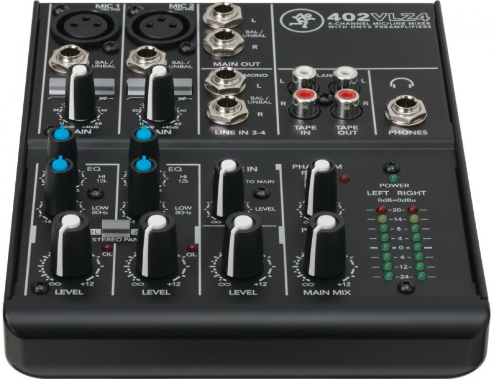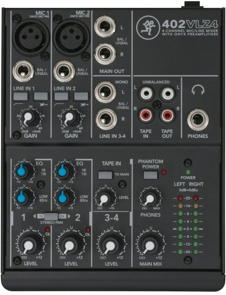 Konkrétně 402-VLZ4 je kompaktní 4 kanálový mixpult, který nabízí 4 linkové a 2 mikrofonní vstupy, kdy u mikrofonních jsou použity kvalitní předzesilovače Onyx, které můžete znát z těch nejvyšších řad Mackie. Ty nabízí až 60 dB rozsah gainu, díky čemuž je možné v dynamickém rozsahu dostat až na 128,5 dB. Zajišťují to nejvěrnější zesilení signálu na všech frekvencích a minimální úroveň zkreslení. Samozřejmě nabízí i phantomové napájení při použití kondenzátorových mikrofonů. U 402-VLZ3 lze použít i dva nástrojové vstupy, díky kterým nebudete potřebovat žádné DI boxy.