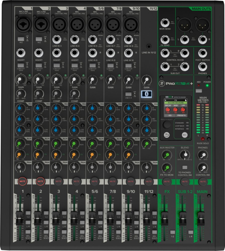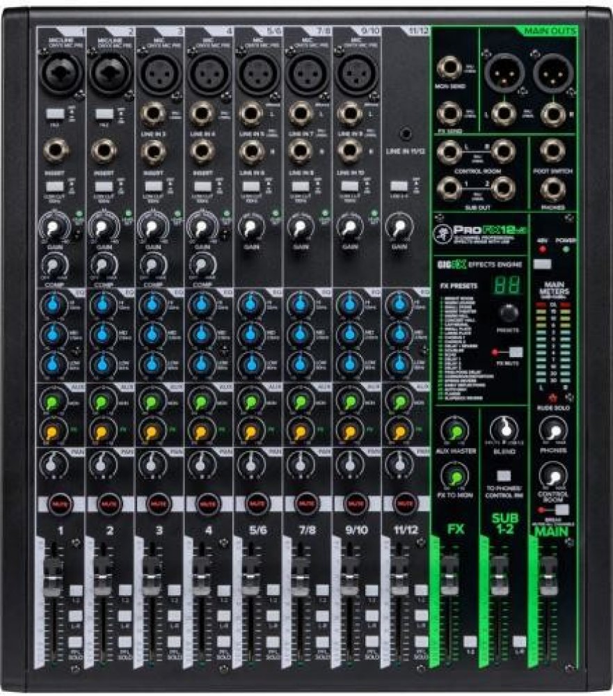 Konkrétně ProFX12v3 je dvanáctikanálový mixážní pult se sedmi Onyx preampy a GigFX zvukovým enginem. Zvuk lze nastavit pomocí intuitivních ovladačů a třípásmového ekvalizéru na každém kanálu, kromě dvou Kombi XLR/Jack vstupů disponuje pult také Hi-Z vstupem pro přímé zapojení kytary/baskytary, pěti XLR/stereo Jack vstupy a Line IN pro hudební přehrávač nebo mobilní zařízení. Dále zde najdete výstup pro monitory, hlavní výstup, výstup pro sluchátka a vstup pro footswitch.