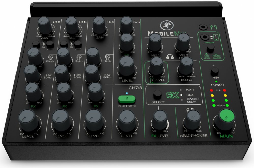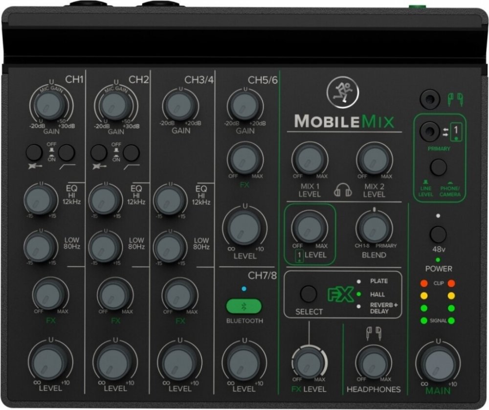 MobileMix je audio mixpult napájený z USB pro produkci A/V, živé ozvučení a streamování. Tento miniaturní mixážní pult je vybaven osmi kanály, dvěma mikrofonními/nástrojovými předzesilovači, rozhraním Bluetooth s funkcí Mix Minus, stereo linkovými vstupy, ekvalizérem, efekty a dalšími funkcemi.MobileMix je nejjednodušší způsob, jak získat legendární zvuk Mackie na cestách – plnohodnotný malý zvukový mixážní pult, který můžete napájet přes USB nebo nabíjecí USB napájecí blok (není součástí dodávky).MobileMix funguje na flexibilní napájení z USB, což vám dává nesčetné možnosti pro provoz zvuku mimo zásuvky. Naší oblíbenou možností je použití nabíjecí baterie USB,* stejné, jakou používáte pro svůj chytrý telefon nebo fotoaparát. Zařízení MobileMix má pod sebou skrytou přihrádku na baterie, která je navržena tak, aby se do ní vešla většina externích baterií, čímž se zařízení MobileMix mění ve skutečně bateriemi napájený mixážní pult.Připojte dva smartphony nebo fotoaparáty najednou prostřednictvím konektorů TRRS pro odesílání a přijímání zvuku z obou a pomocí stereo linkového vstupního kanálu TRS přiveďte externí zdroje včetně přehrávacích zařízení, živých mixážních pultů, notebooků, nástrojů linkové úrovně, jako jsou klávesy, a dalších.Jelikož dokáže odesílat a přijímat zvuk bezdrátově na vyhrazeném kanálu Bluetooth, dokáže MobileMix působivé věci, například streamovat hudbu z jednoho zařízení a zároveň nahrávat do druhého nebo zachytávat oba konce telefonického hovoru najednou pomocí funkce Mix Minus, která odstraňuje ozvěnu, která by to za normálních okolností znemožnila.MobileMix se vyznačuje legendární kvalitou provedení a vynikajícím zvukem, díky nimž si společnost Mackie získala důvěru po celém světě. Začíná dvěma plně vybavenými mikrofonními předzesilovači s kombo XLR a 1/4" konektory, přepínači impedance Hi-Z pro elektrické kytary a jiné pasivní nástroje, low-cut filtry a 48V fantomovým napájením pro kondenzátorové mikrofony.Dokonce i když streamujete živě, MobileMix vám umožňuje zachytit a směšovat všechny zvuky do ucelené, čisté a působivé produkce, a to za chodu. Stejně jako proslulé živé mixážní pulty Mackie používané po celém světě, i MobileMix vám dává možnost formovat EQ na jednotlivých kanálech.