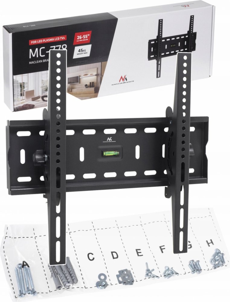 Držák na TV do 45 kg 26"- 65" palců 400x400 VESA - Maclean MC-778Univerzální držák Univerzální držák pro monitor / LED / plazmu / LCD vhodný pro všechny značky s níže uvedenými rozměry VESA. Vhodný pro většinu komerčně dostupných plazmových, LCD / LED monitorů. Vhodný pro televizory s úhlopříčkou od 26" do 65" a hmotností do 45 kg a vhodný pro všechny značky s roztečí otvorů podle normy VESA až 400x400. Úspora místa Držáky Maclean zaujmou malou vzdáleností od stěny, pevnou konstrukcí a kvalitním zpracováním. Držáky Maclean umožňují prostorově úspornou montáž televizoru s plochou obrazovkou na stěnu. Stupeň náklonu můžete nastavit v rozmezí od -15° do +15°. Špičková kvalita Držáky Maclean jsou známé svou špičkovou kvalitou, a proto se naše značka již těší velkému počtu spokojených zákazníků po celém světě. Snadná montáž Držáky Maclean se vyznačují velmi jednoduchou a rychlou montáží. Montážní šrouby jsou součástí dodávky.Vlastnosti: Sada Maclean Maclean je vybavena speciálním systémem pro upevnění a montáž: - Typ: nástěnný držák televizoru - Nosnost: max. 45 kg - Úhlopříčka obrazovky: 26" až 65" palců - Rozteč horizontálních otvorů VESA: 100 až 400 mm - Vertikální rozteč otvorů VESA: 100 až 400 mm - Materiál: Vysoce kvalitní kovová konstrukce - Barva: černá prášková barva - Integrovaná vodováha - Včetně návodu a montážního příslušenství Tento držák podporuje následující standardy VESA: 100x100, 200x100, 200x200, 200x300, 300x300, 200x400, 300x400, 400x400 mm Před nákupem si prosím ověřte VESA, velikost obrazovky a hmotnost vašeho televizoru! Ideální nástěnný držák pro monitory a televizory od kvalitního výrobce Maclean !