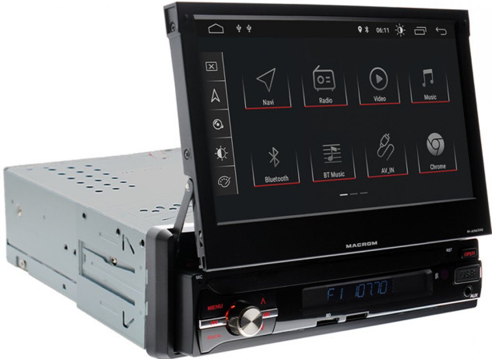 MACROM M-AN6560 je multimediální jednotka s operačním systémem Android. 1DIN velikost a 7" kapacitní displej ve formě terý je motorově vysunováný z těla přístroje, umožňuje instalaci do řady automobilů, kam doposud nebylo možné instalovat jednotku s touto velikostí monitoru.