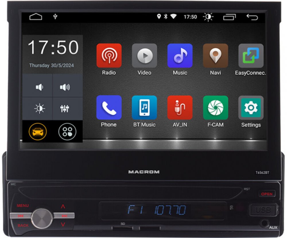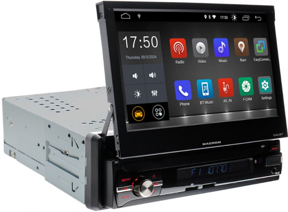 MACROM M-T6562BT je multimediální jednotka s operačním systémem Android10. 1DIN velikost a 7" kapacitní displej ve formě terý je motorově vysunováný z těla přístroje, umožňuje instalaci do řady automobilů, kam doposud nebylo možné instalovat jednotku s touto velikostí monitoru.