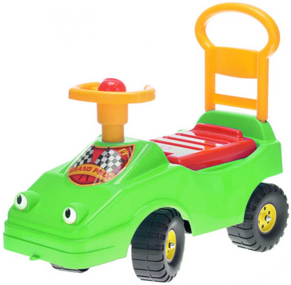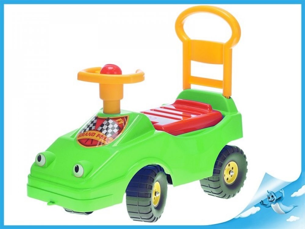 Veselé barevné odrážedlo (závodnička) autíčko s očima, z kvalitního plastu, v zelené barvě, pro ty nejmenší motoristy. Bezpečné vozítko s opěradlem, pro malé děti. Funkční klakson - mechanický zvuk -