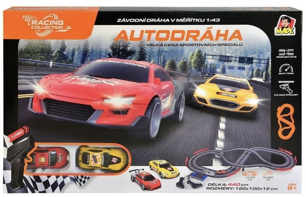 Který závodník bude nejrychlejší a oslaví triumfální příjezd do cíle? Elektrická autodráha Made v měřítku 1 : 43 je jedinečným dárkem pro všechny malé i velké milovníky aut. Dráha o celkové délce 440 cm zajistí závody plné napětí od začátku až do konce. Autíčka se mohou prohánět na 2 tratích. Po projetí každého kola nechybí světelné efekty umocňující zážitek. Jejím výrobním materiálem je plast a k...