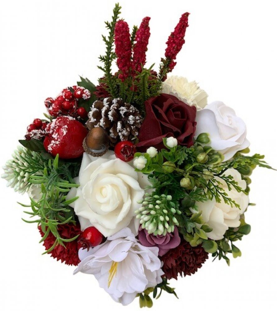 Elegantní mýdlová kytice v bordo-bílém vánočním tónu je nádhernou ozdobou i originálním dárkem pro vaše blízké. Mýdlové květy jsou aranžovány v kovovém obalu o průměru 15 cm a doplněny o umělou zeleň.