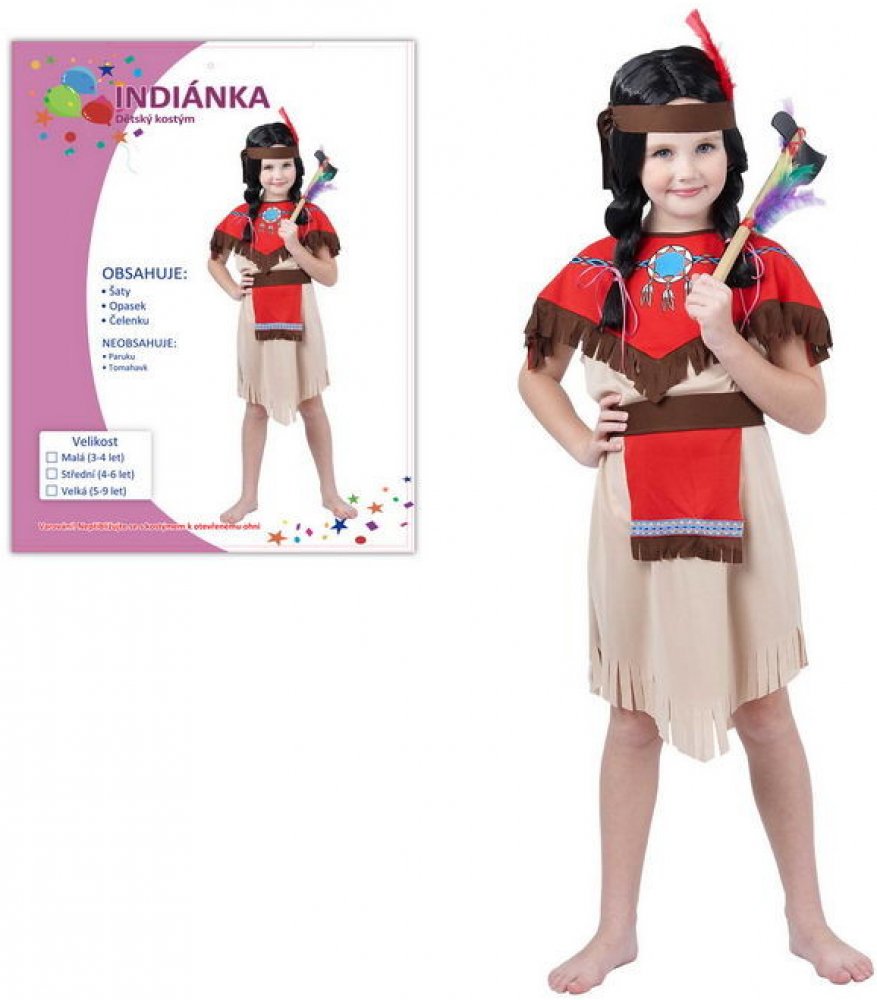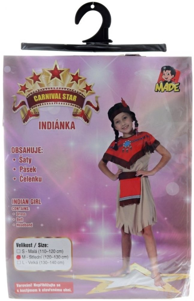 MADE - Karnevalový kostým - Indiánka s čelenkou, 120-130 cm Chystáte se s dítětem na karneval, dětskou párty nebo na významnou kostýmovou událost ve škole či školce? Potom je na místě důkladný výběr vhodného kostýmu. Zkuste se zamyslet, jaký konkrétní převlek vystihne dětskou osobnost, významnou vlastnost, jaký kostým vašemu dítěti bude nejvíce slušet. Bude to kostým komiksového hrdiny, pohádkový kostým, převlek znázorňující nějaké povolání anebo krásné šaty pro princeznu? Při výběru kostýmů a tvorbě případných doplňku zažijete s dítětem spoustu zábavy. Odměnou vám i vašemu dítěti bude radost a spousta zážitků. Staňte se společně hvězdou karnevalu.Karnevalový kostým - Indiánka.Velikost: Střední (120 - 130 cm).Obsahuje: šaty, opasek, čelenkuNeobsahuje: tomahavk, paruku.Kostým je vhodný pro děti ve věku 5 - 9 let.