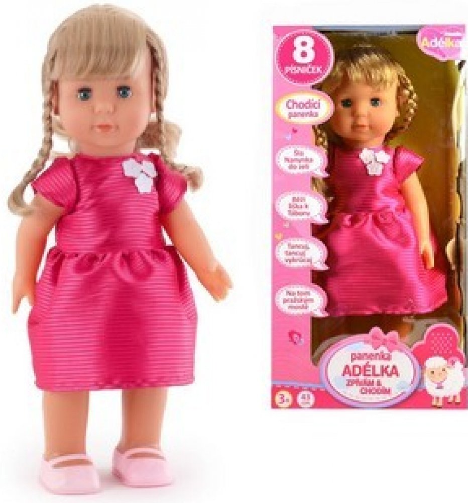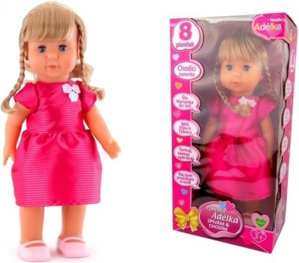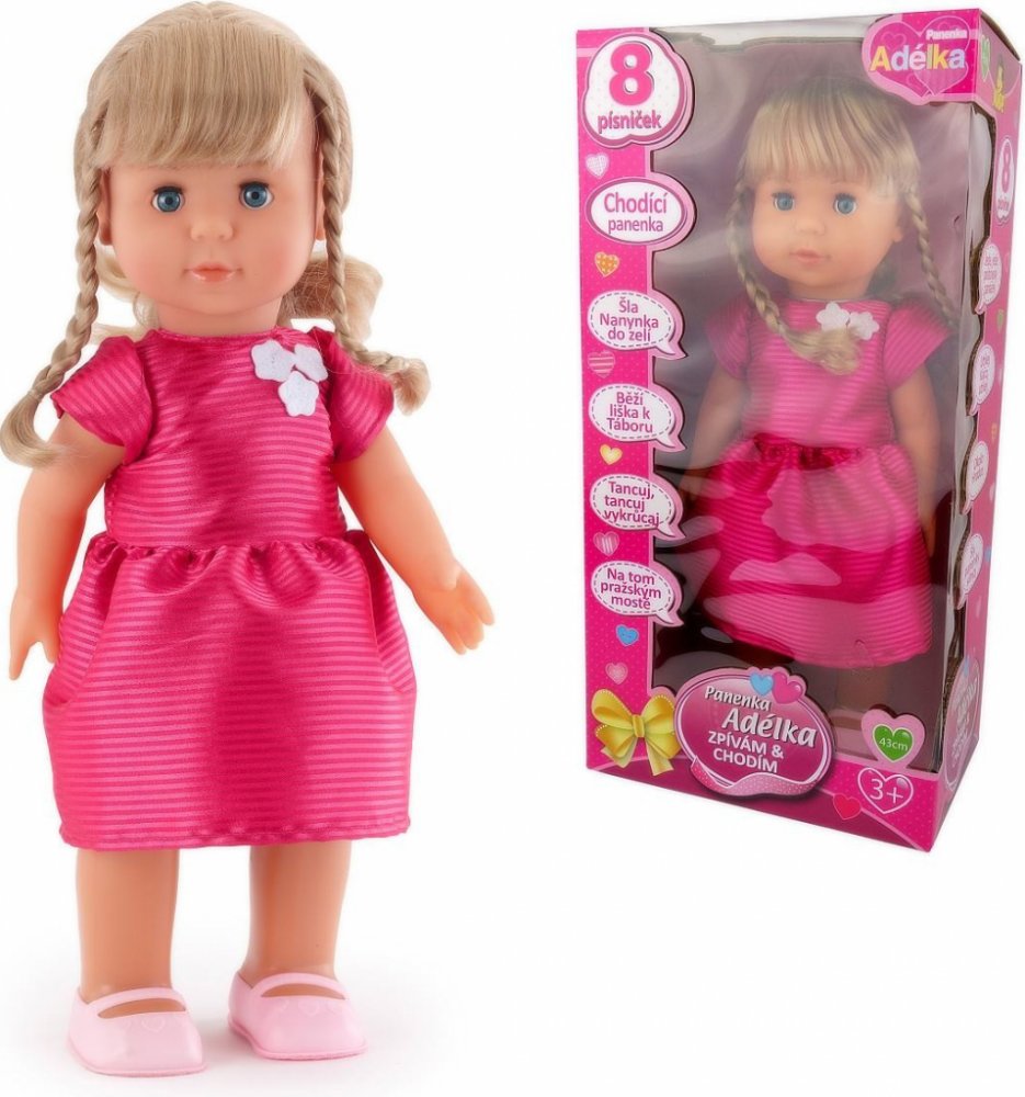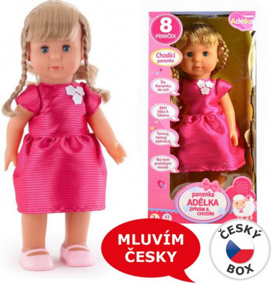 Zatleskej a panenka začne cupitat vpřed a zpívat jednu z 8mi českých písniček. Výška panenky 43 cm.