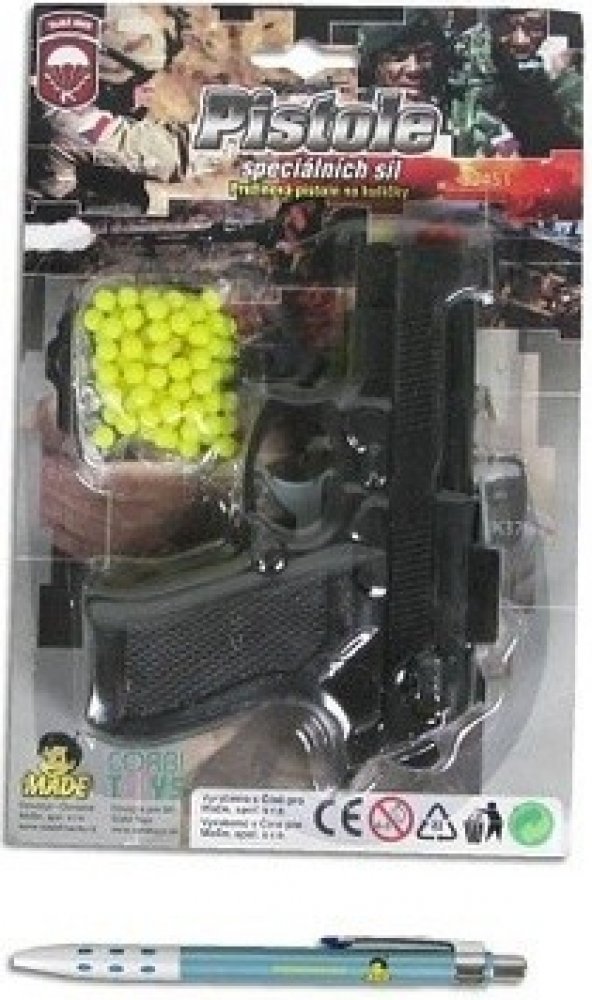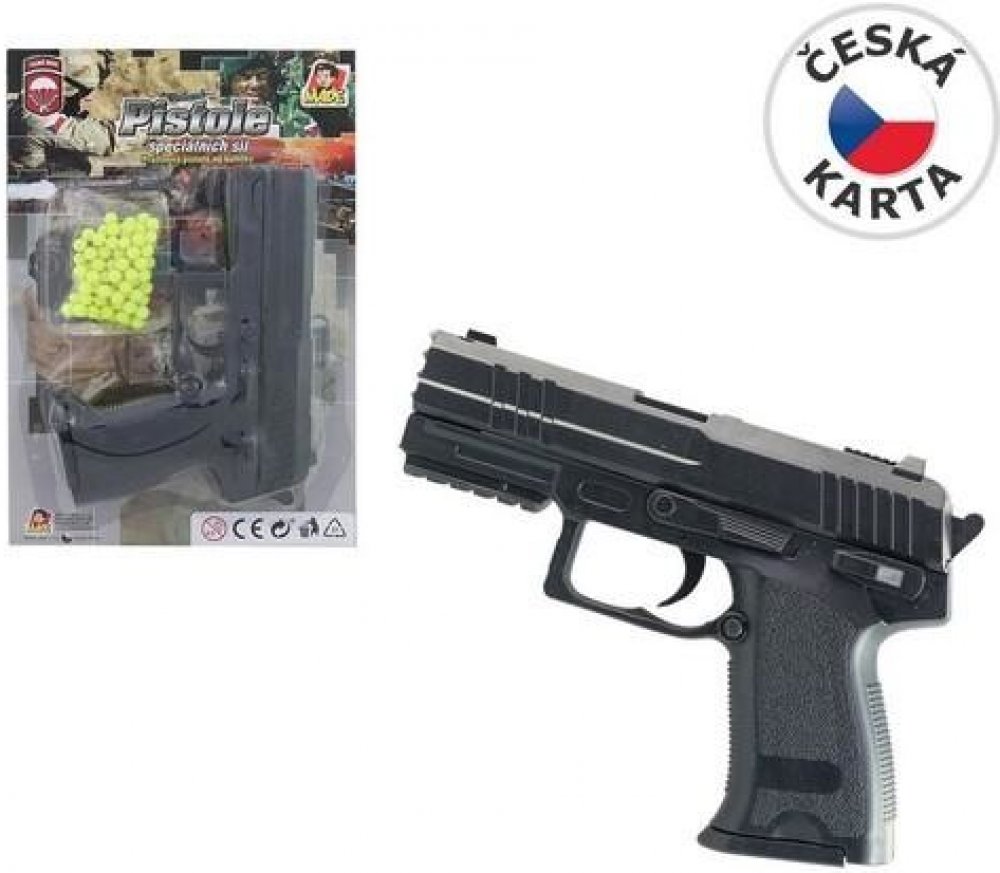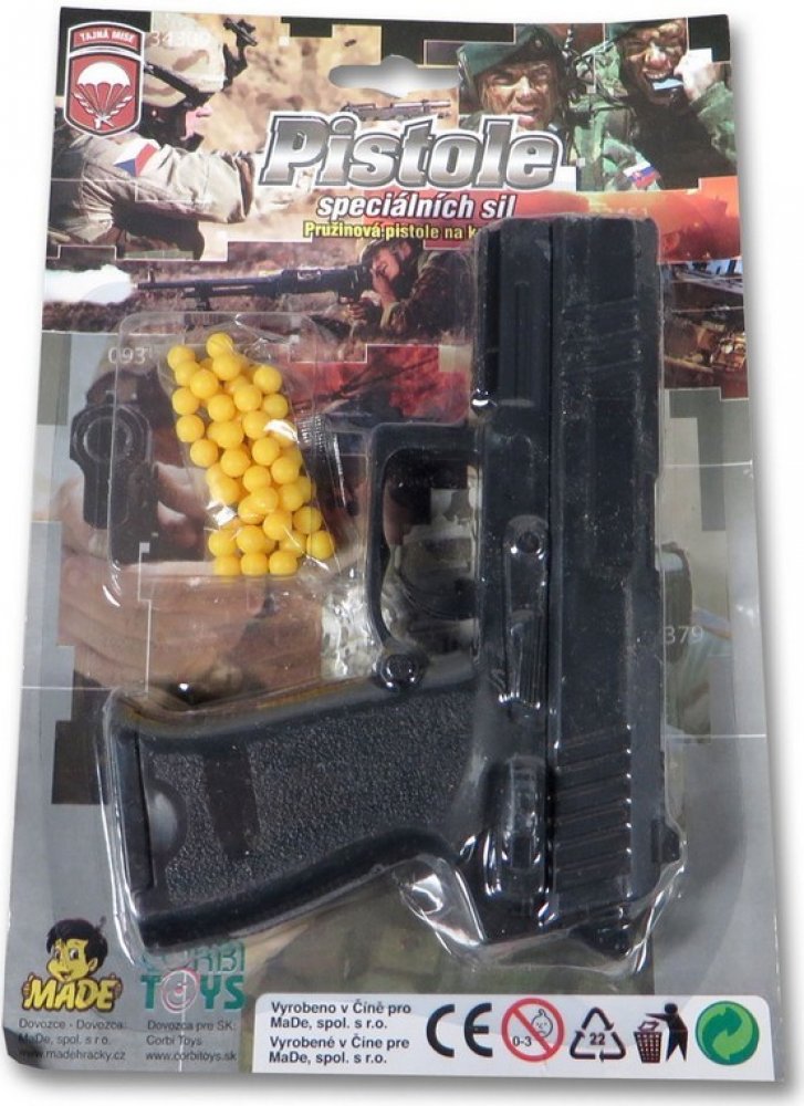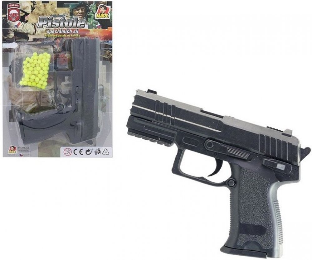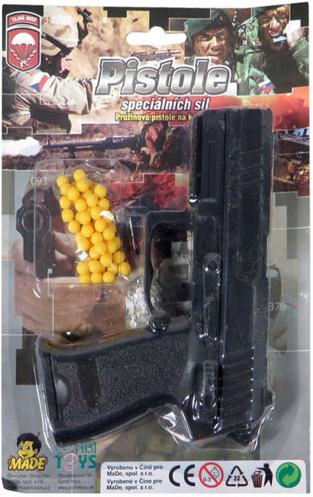 Plastová pistole speciálních sil na kuličky, pro děti, na kartě. Pistole s náboji (kuličkami) z plastu pro všechny malé bojovníky a strážce zákona.