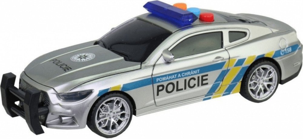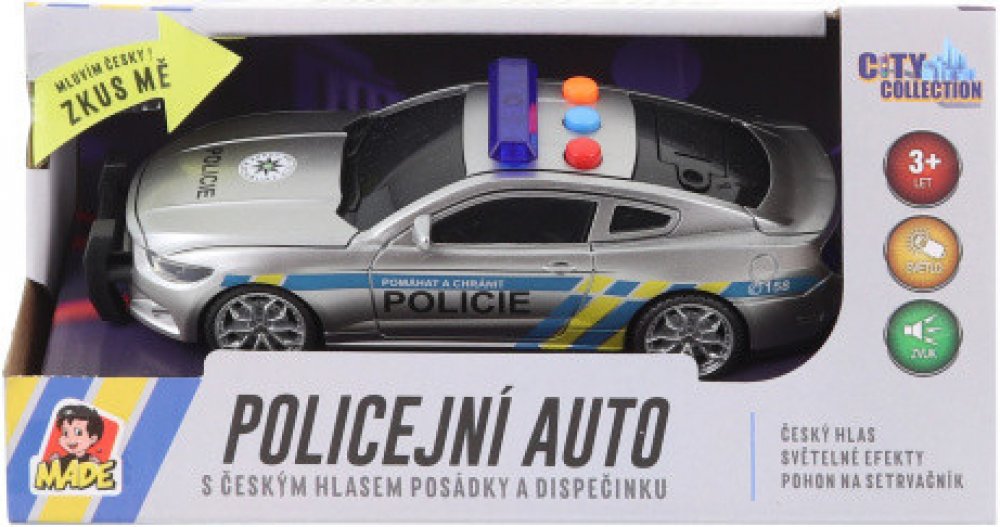 Policejní auto o rozměru cca 16,5 x 7 x 5 cm na setrvačník s českým hlasem posádky a dispečinku. Po stisknutí knoflíku auto svítí a vydává zvuky. Napájení 3x baterie AG13 - jsou součástí balení. Rozměr balení cca 21 x 11 x 8 cm. Věk 3+