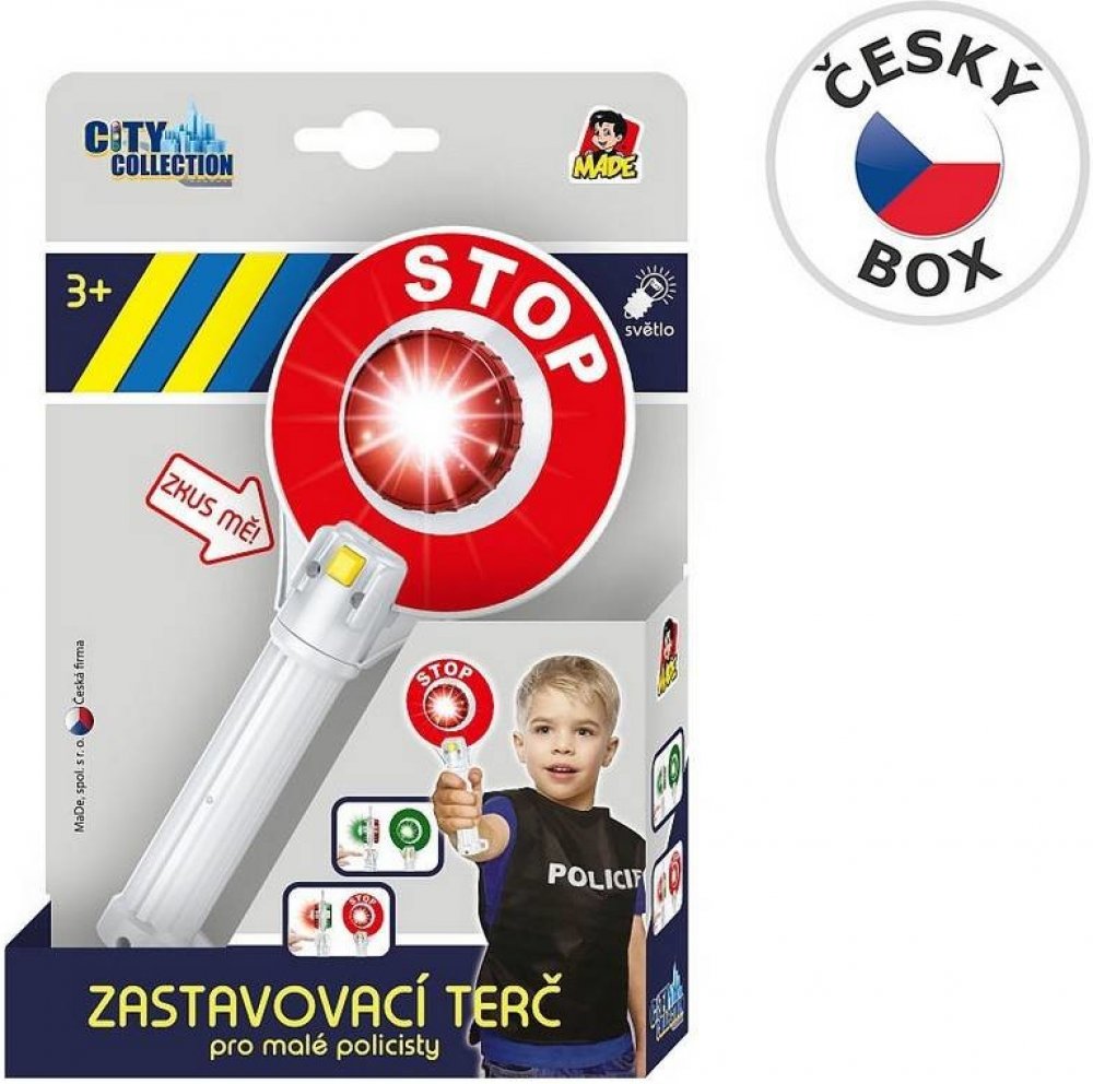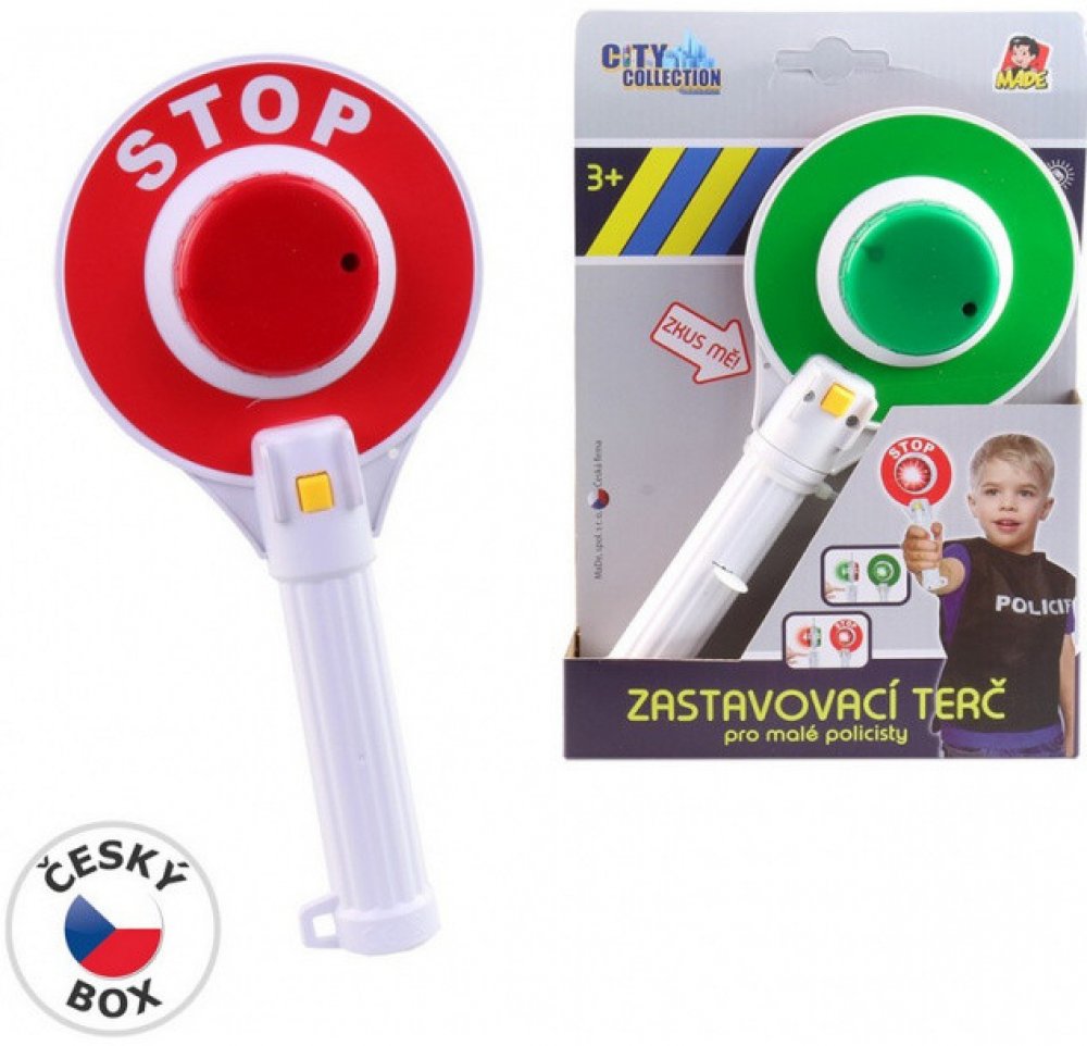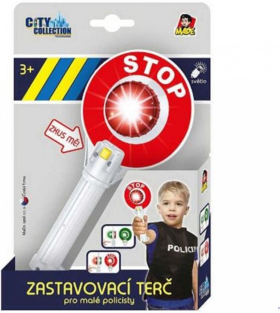 Policejní plácačka z české řady City Collection, 25 x 17 cm.Nesmí chybět ve výbavě, každého správného policisty. Plácačka má světelné efekty. Napájení je na 2 x 1,5V AA baterie, které jsou součástí balení. Hračka je určena pro děti 3+. Rozměr hračky je 23cm. Materiál hračky je plast. Balení hračky je open box.