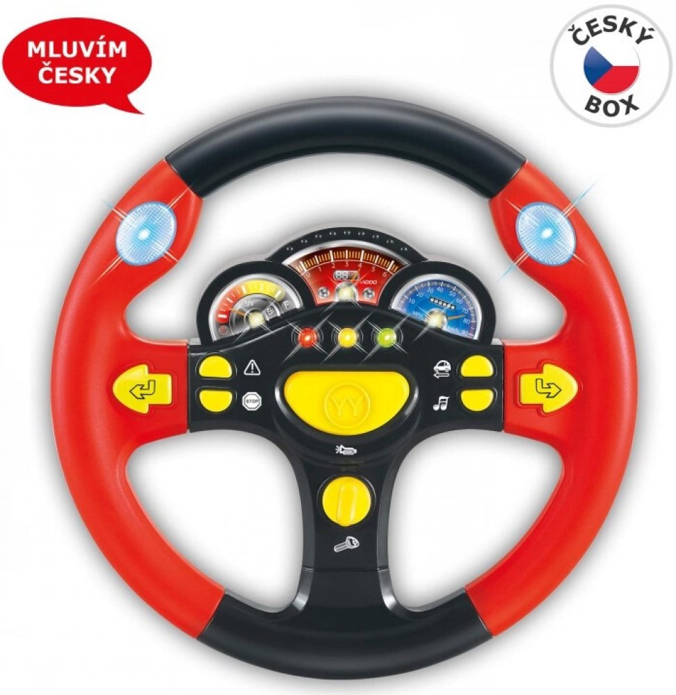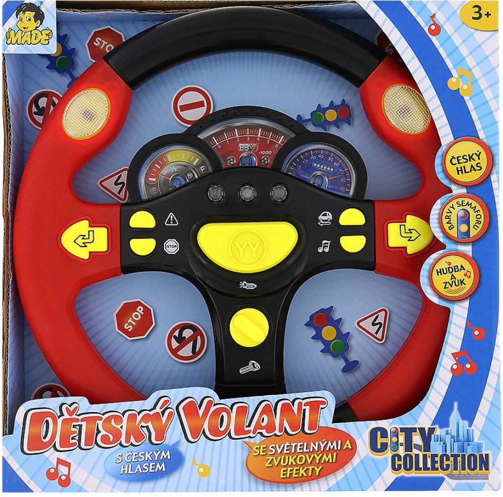 Volant se zvukovými a světelnými efekty: KLAKSON, JEĎ (zvuk rozjíždějícího auta), VPRAVO nebo VLEVO(blikání a zvuk směrového světla), HUDBA, STŮJ (zvuk brzd), BARVY SEMAFORU