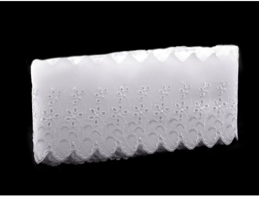 p Madeira s dírkovanou výšivkou je vhodná k ozdobení nejen oblečení (šatů, tunik, sukní, halenek apod.), ale také bytového textilu, například polštářů, povlečení, deček, kuchyňských záclonek, ubrusů atd. br / Šíře nevyšité části se může mírně lišit (±10%). br / Šíře: 11,5 cm br / Šíře vzoru: 80 mm. br / Cena je za jeden metr. /p
