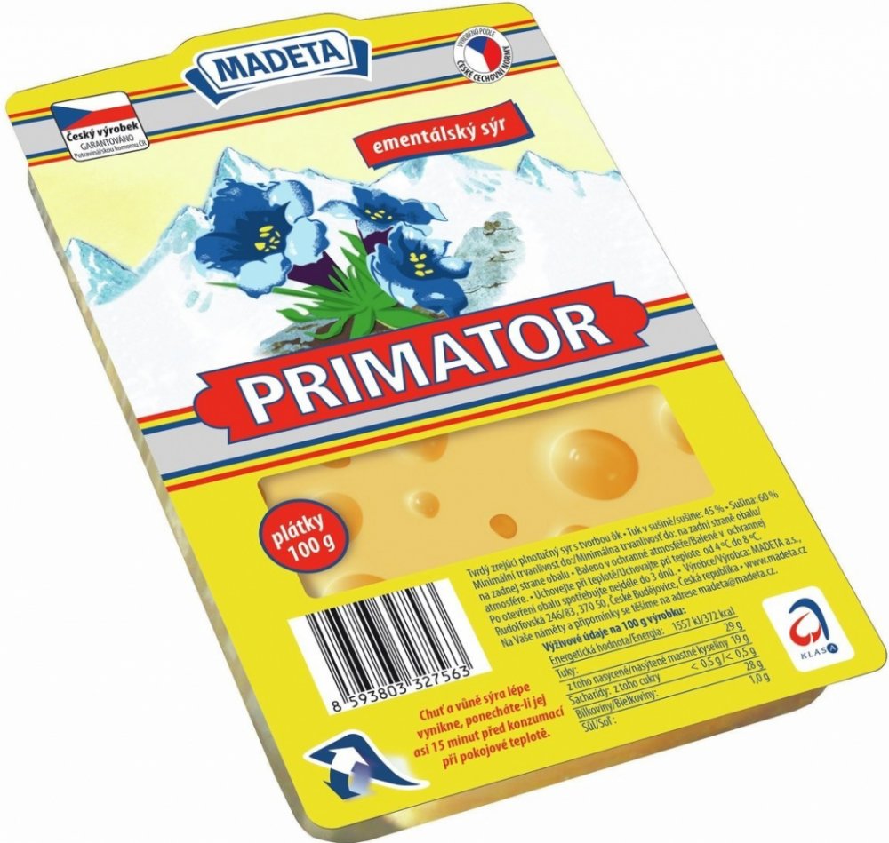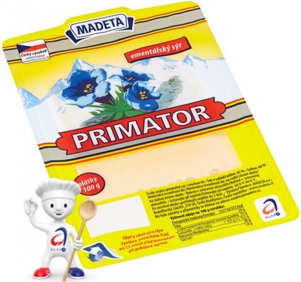 Cena se může v jednotlivých regionech lišit. -- Primator je právem označován jako jediný sýr s lomem. Díky této technologii výroby, při které nejsou použity téměř žádné tavicí soli, má Primator tuhou konzistenci. Označení „sýr s lomem“ je odvozeno od lomu, který vznikne při rozdělení sýra. Přírodní sýr ementálského typu Primator je ideální na výrobu sýrových mís, dá se snadno strouhat i krájet. Lz...