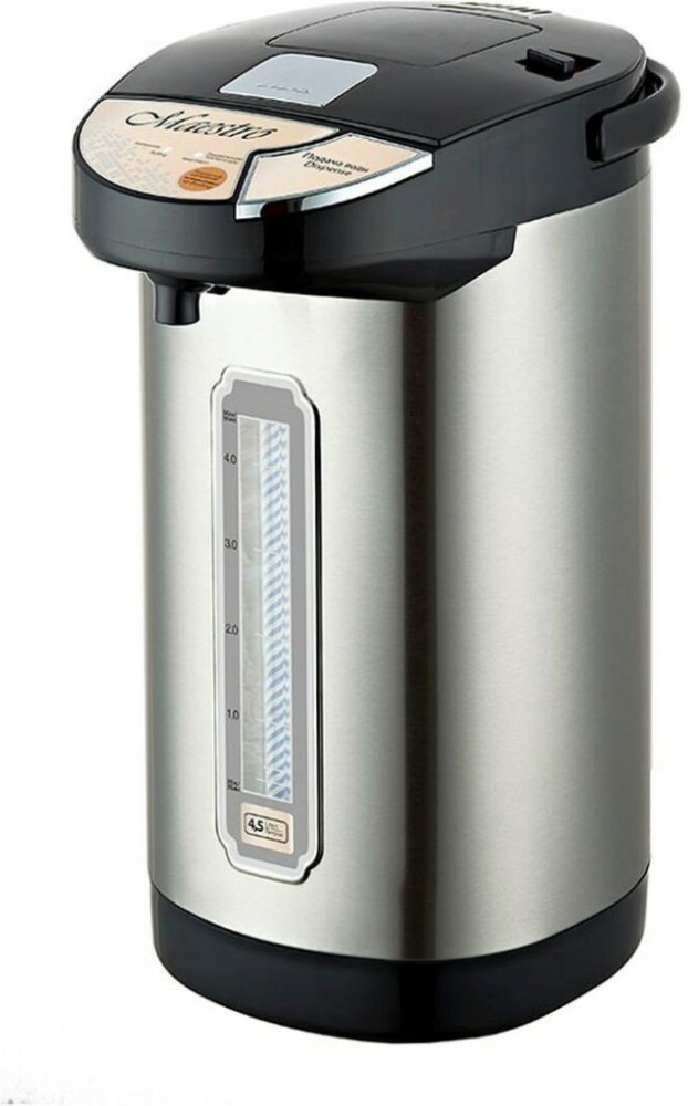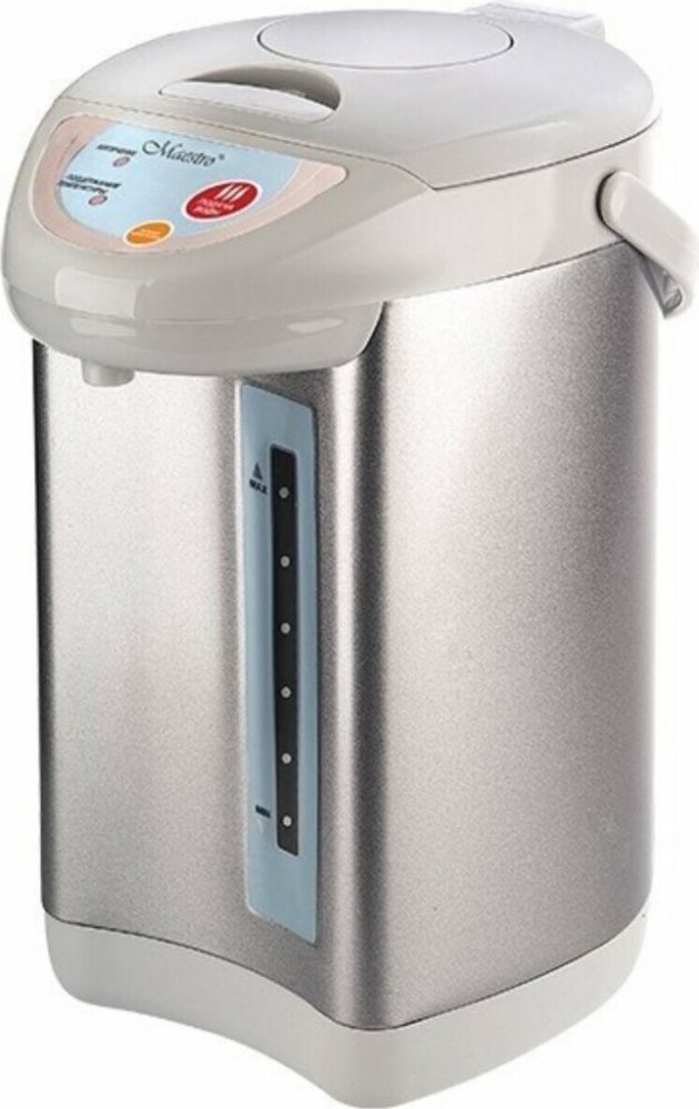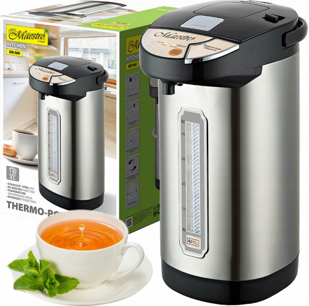 Ohřívač vody Maestro MR-080N je vyroben z nerezové oceli a plastu a má také elektrické a ruční čerpadlo pro nalévání vody. Ergonomická rukojeť usnadňuje přenášení.