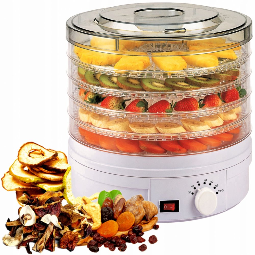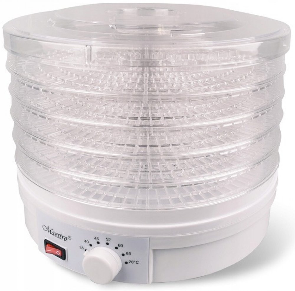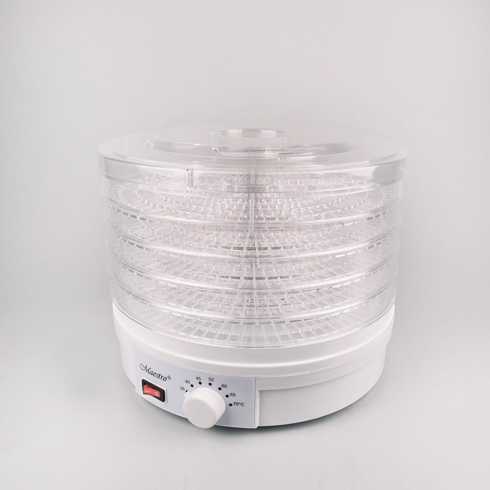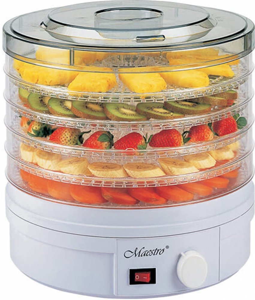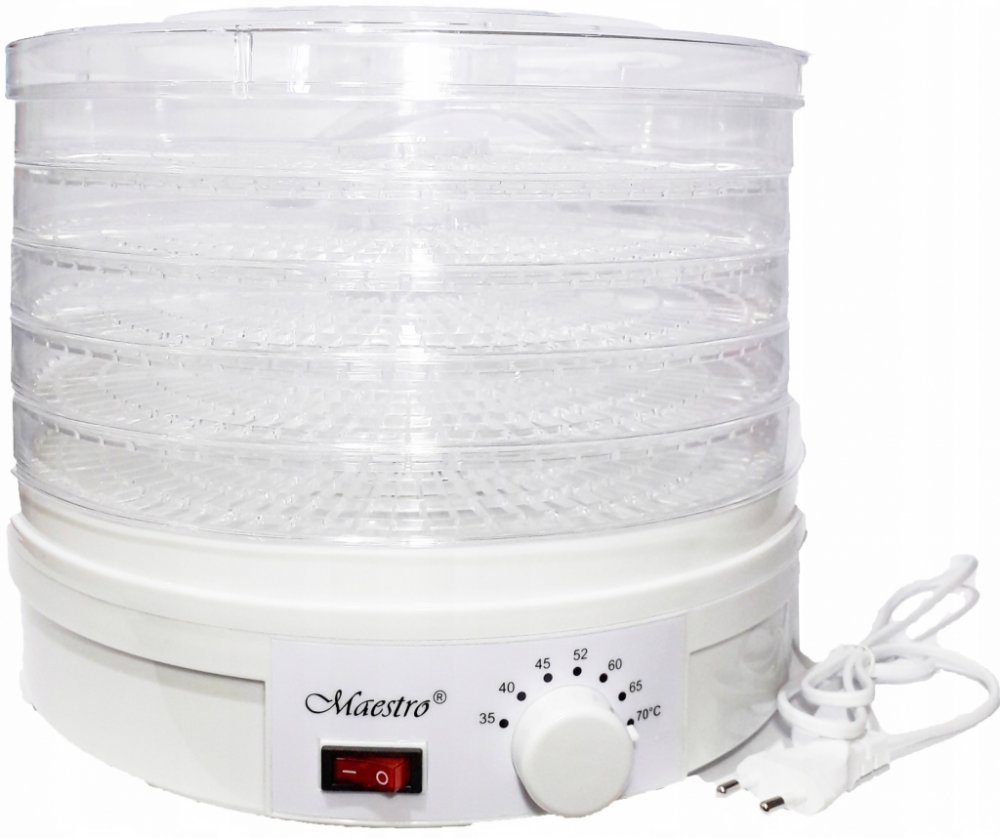 Sušička hub, zeleniny a ovoce Maestro MR-765 je výkonné zařízení s příkonem 245 W, ideální pro sušení různých produktů, jako jsou houby, zelenina, ovoce, bylinky nebo chléb. Je vybavena 5 síty o průměru 32 cm, přičemž výška každého síta je 3 cm, což umožňuje sušit velké množství surovin najednou. Přístroj nabízí 7stupňovou regulaci teploty od 35 °C do 70 °C, což umožňuje přesně nastavit podmínky sušení podle potřeb různých produktů. Mechanické ovládání usnadňuje obsluhu a podsvícený vypínač dodává sušičce moderní vzhled a usnadňuje kontrolu jejího provozu. Sušička Maestro MR-765 může pracovat nepřetržitě až 40 hodin, což je velmi praktické při sušení většího množství surovin. Spotřebič má výšku 26 cm a délka napájecího kabelu je 115 cm, což zajišťuje pohodlné používání a snadné umístění na kuchyňské lince. Sušička je ideálním řešením pro ty, kteří si cení přírodních metod uchovávání potravin.