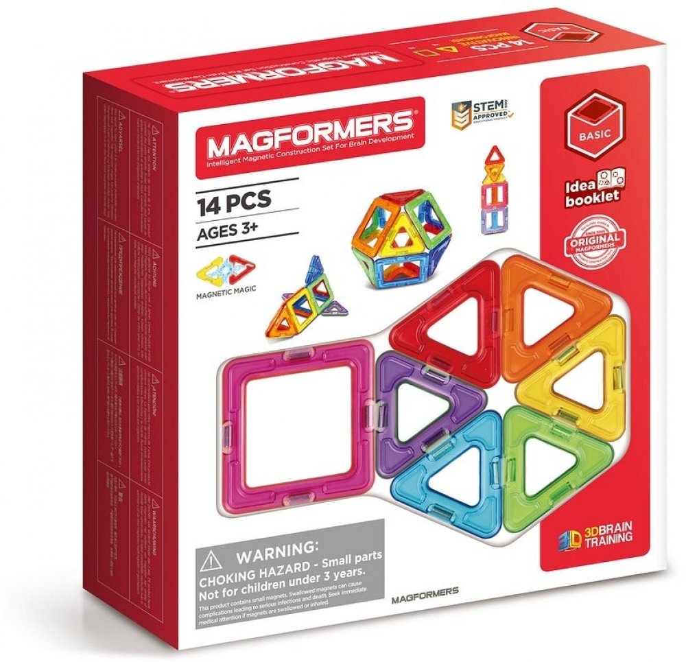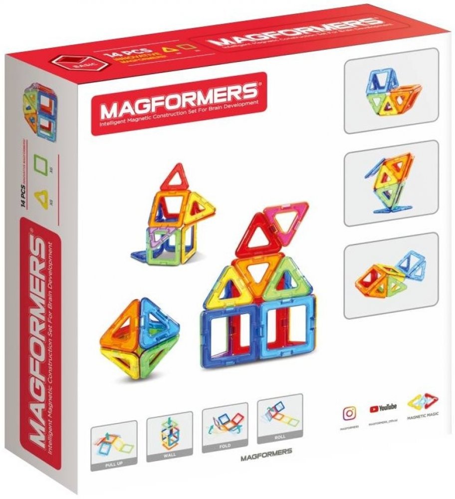 Magformers-14 je magnetická stavebnice pro nejmenší děti. Je to základní geometrická sada, ze které již lze vytvořit překvapivě mnoho různých jednoduchých staveb a geometrických těles vč. několika Platonských i Archimedových těles.