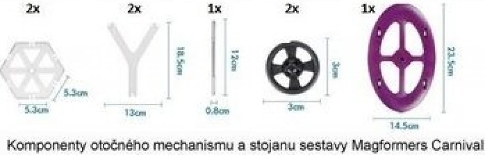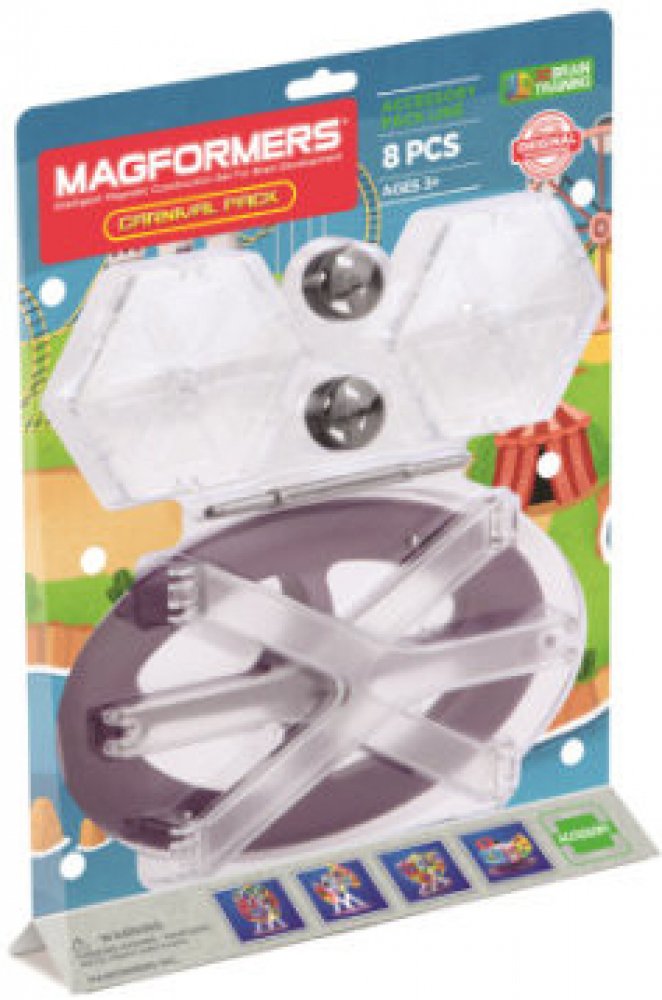 8-dílná sada Magformers Carnival je se mnoha částmi příslušenstvím základem pro tvorbu nádherných modelů. Vyber si dílky ze své sbírky Magformers a sestav s touto sadou kolotoč, ruské kolo nebo houpačky. Detaily výrobku: Materiál: Plast s pevnými neodymovými magnety Obsah: 8 dílů Věk: od 3 let Upozornění Není vhodné pro děti do 3 let. Tento výrobek obsahuje malé magnety. Spolknuté magnety se mohou ve střevě navzájem přitahovat a způsobit vážná zranění. Okamžitě vyhledejte lékařskou pomoc, pokud dojde ke spolknutí magnetu. Prosím, čistěte stavebnici pouze vlhkým hadříkem a bez přídavných čističů.