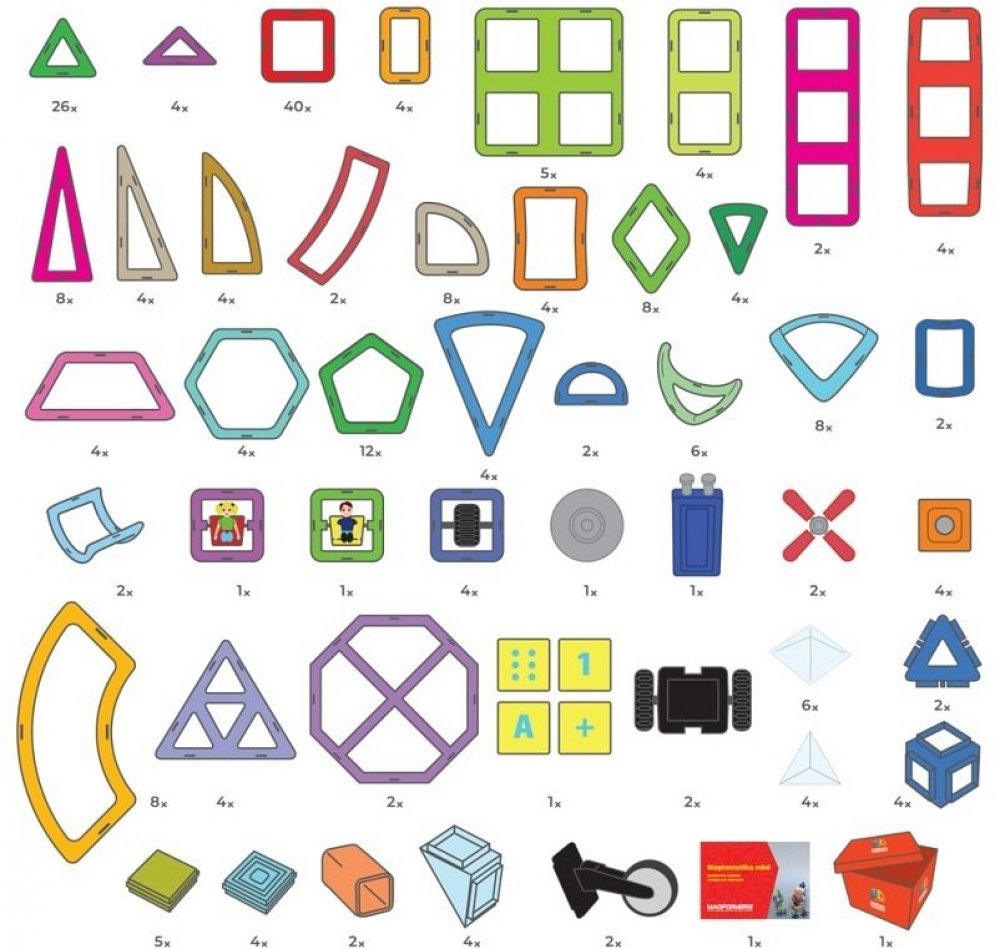 Obsahuje učebnici s názvem Magtematika, která hravou formou děti seznámí se základy geometrie a logiky, např. hledání a skládaní tvarů, plošné sítě, prostorová představivost. Plátěný úložný kontejner s přepážkou, lze využít tak, že do něho předem oddělíte pouze dílky určené pro řešení konkrétních úloh.
