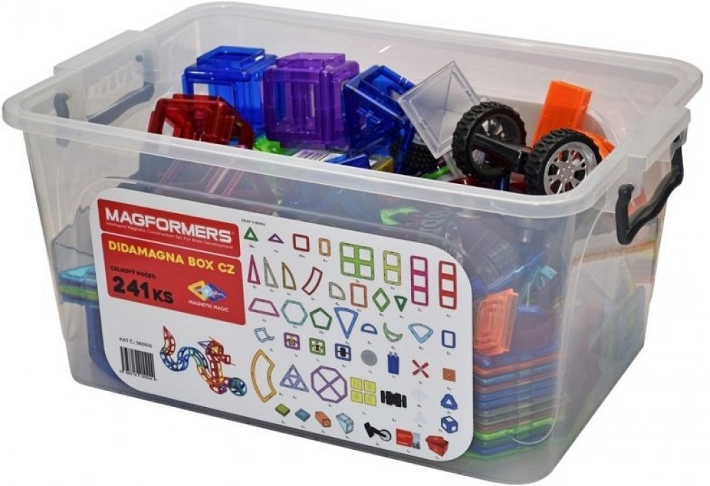 DidaMagna box obsahuje 28 druhů geometrických tvarů, 11 spec. příslušenství a 6 typů zpevňujících nástavců. Je to největší balení dodávané ve velkém plastovém boxu a s dalším plátěným úložným boxem.