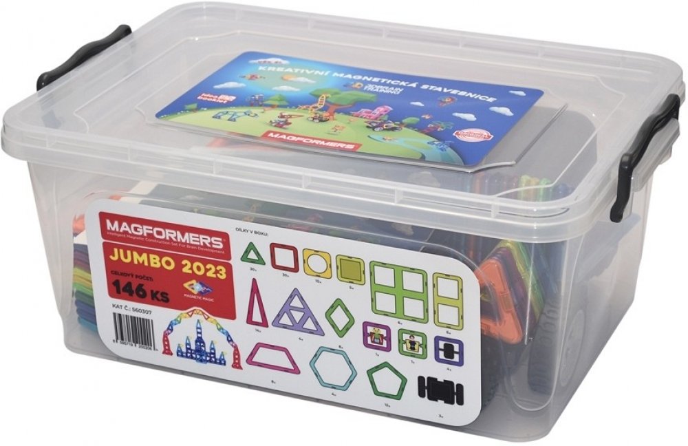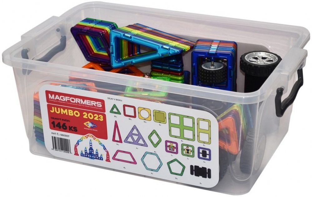 Jumbo box je další z velkokapacitních sestav dodávaných ve velkém plastovém úložném boxu s přezkovým uzávěrem, který již nabízí skutečně dostatečný tvůrčí prostor těm, pro které se Magformers stalo zálibou.